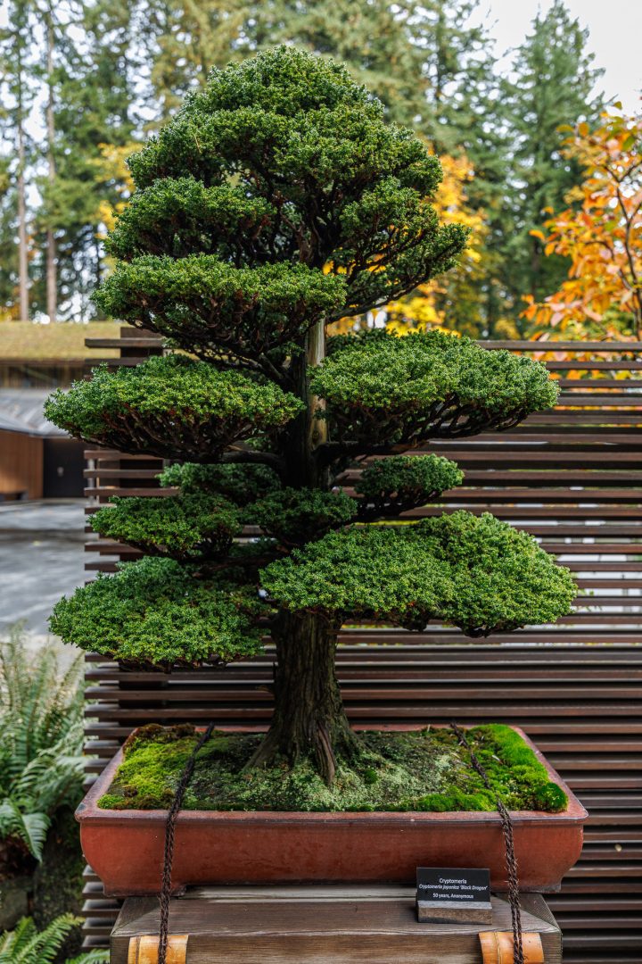 Conçu par le professeur Takuma Tono de l’Université agricole de Tokyo, le jardin propose huit styles de jardins différents. Répartis sur plusieurs niveaux en terrasses, chacun d’entre eux représente les aspects de l’histoire et de la conception des jardins japonais. Le jardin japonais de Portland a été désigné comme le » jardin japonais le plus beau et le plus authentique en dehors du Japon « . Nous avons hâte de le découvrir 😊. Commençons par quelques bonsaïs dont celui-ci avec un tronc magnifique (il a 125 ans).