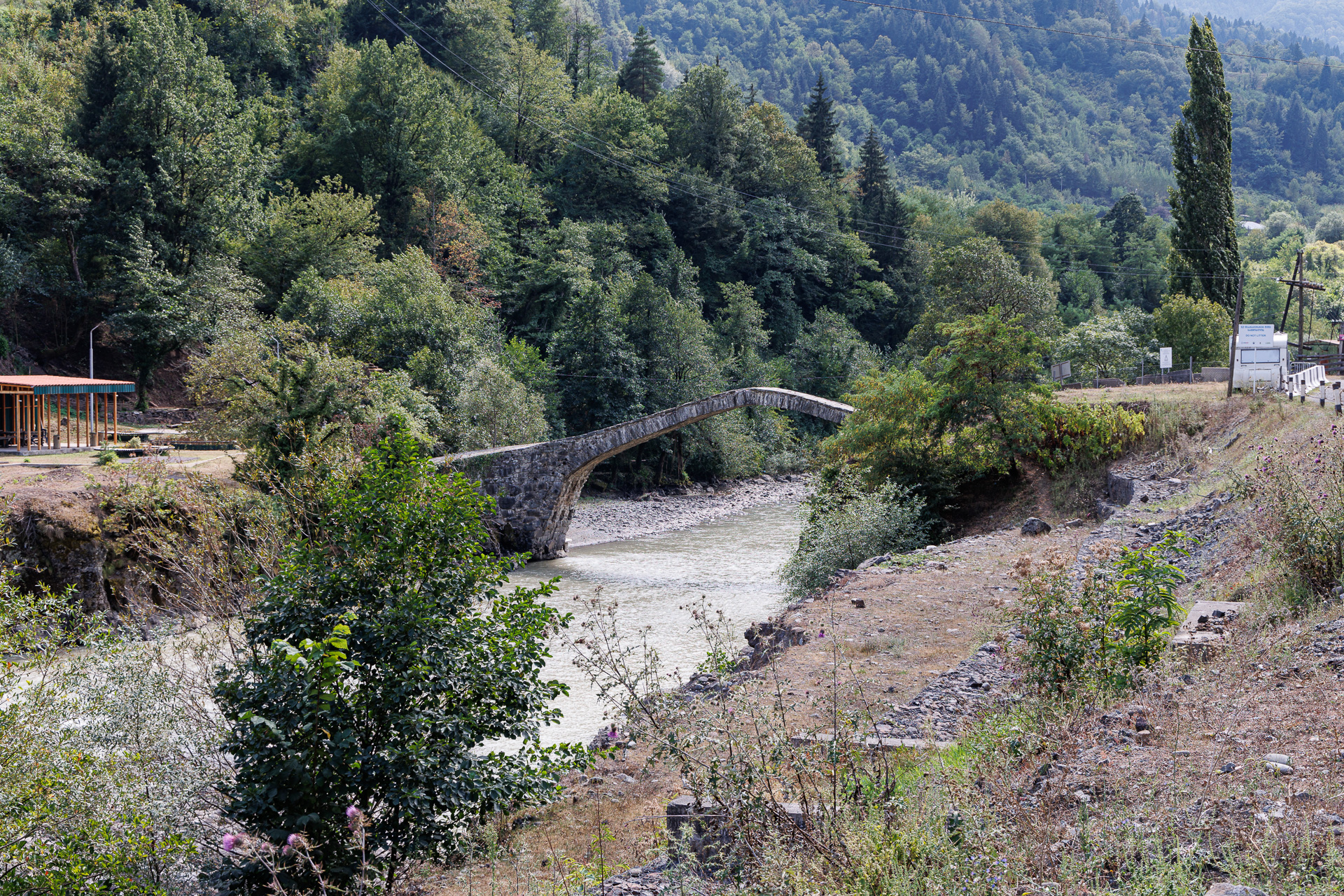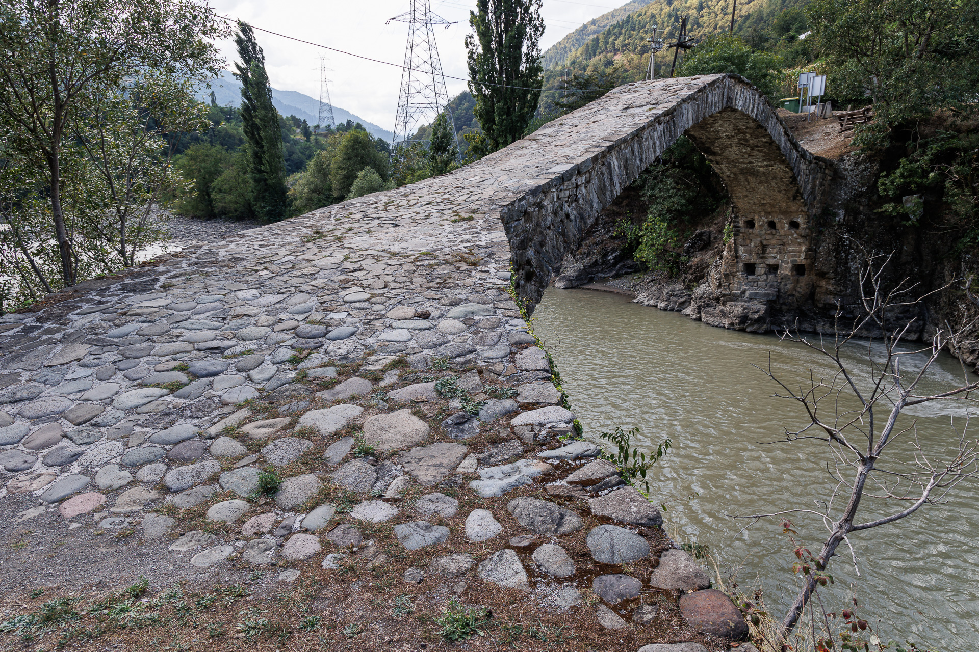 Arrivés dans la vallée, nous rejoignons la rivière Adjaris Tsqali au dessus de laquelle quelques vieux ponts tels que celui-ci l’enjambent. Le pont Dandalo est un des exemples les plus remarquables des ponts de pierre en arche de l’époque médiévale géorgienne (9ème – 10ème siècle).
