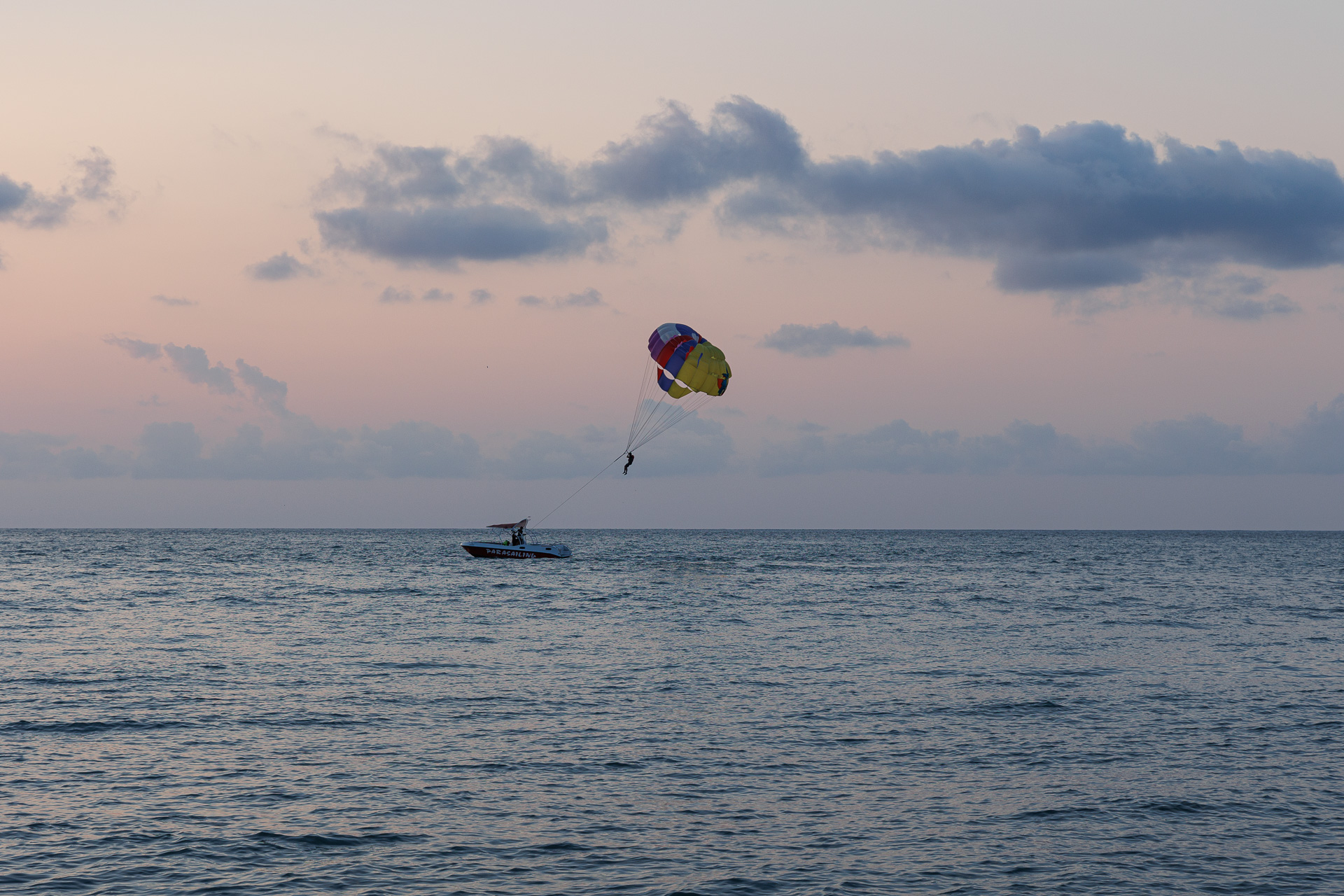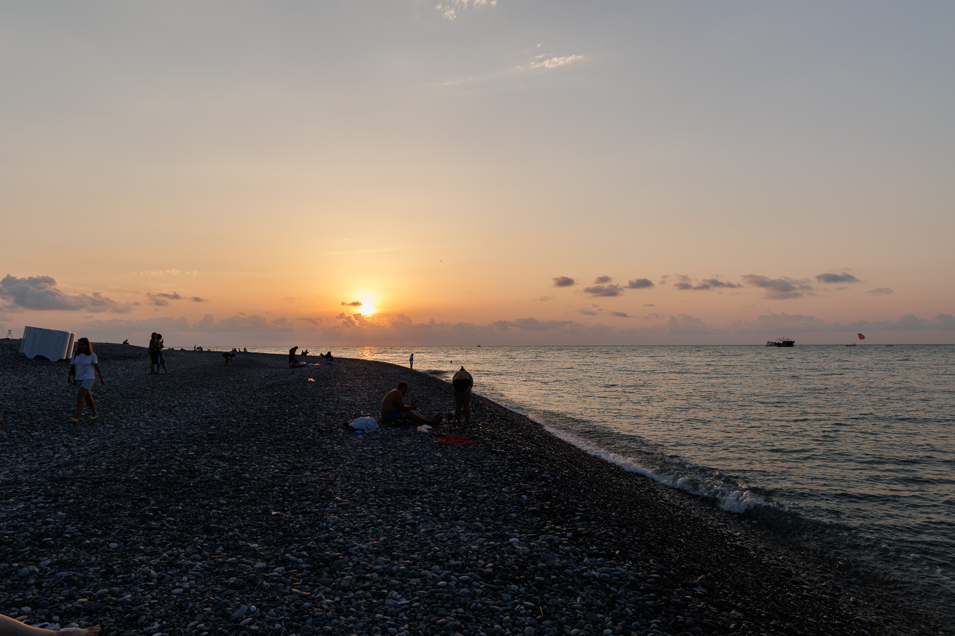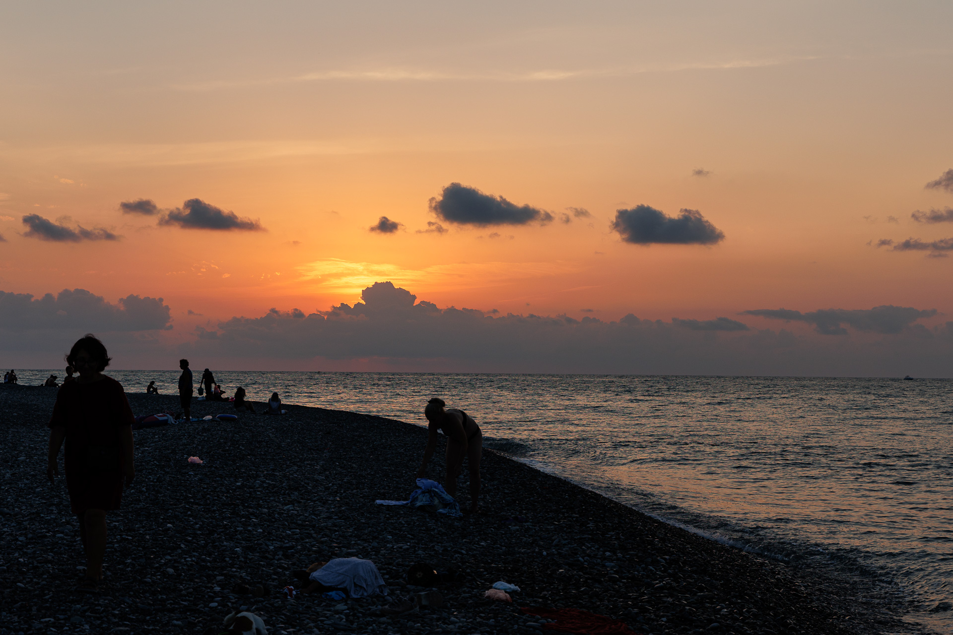 Coucher de soleil sur l’immense plage de galets.