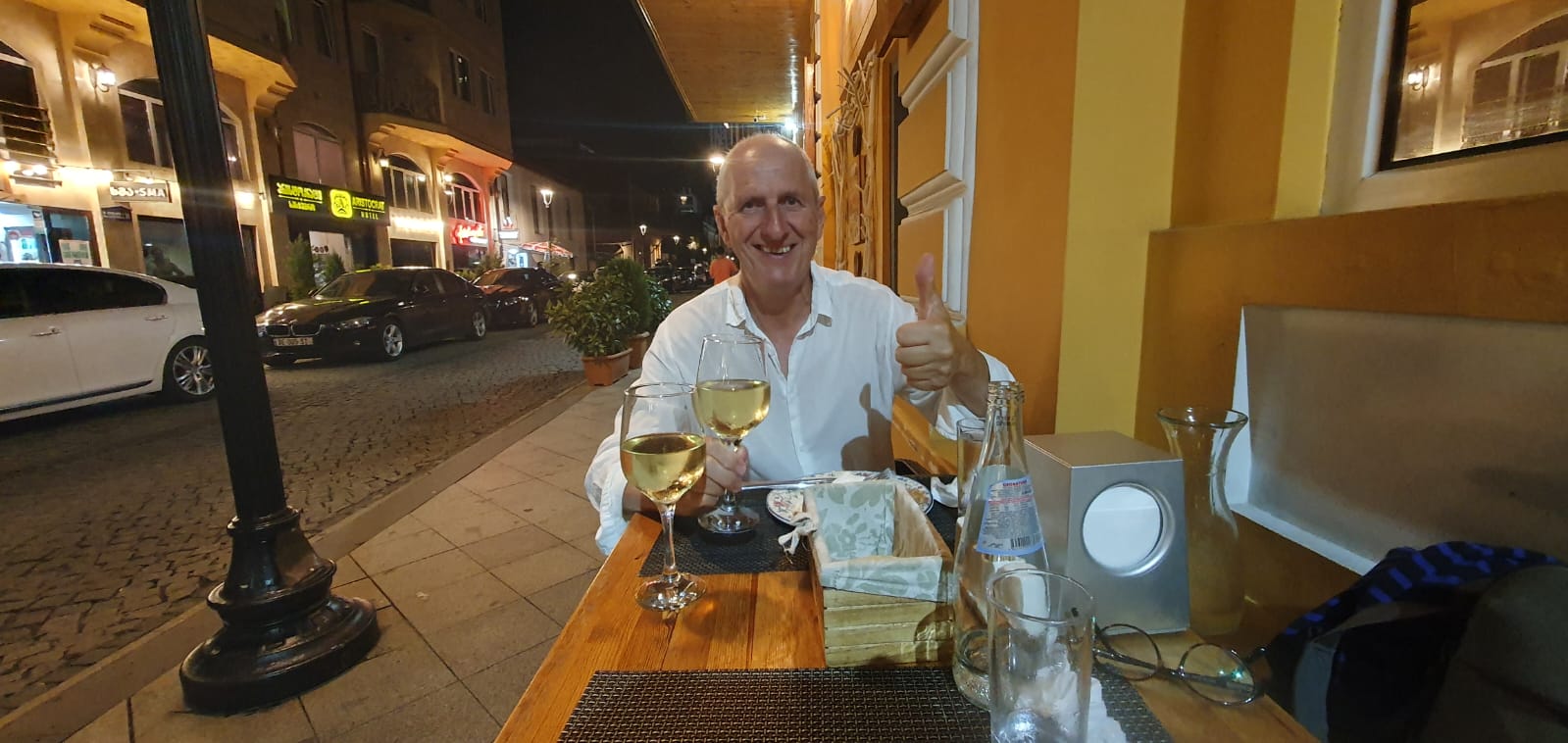 Nous en profiterons pour nous restaurer et réhydrater à l’aide d’un vin blanc géorgien demi-sec assez agréable, mais servi uniquement au verre ou par litre. Alors comme il fait chaud au bord de la mer noire…