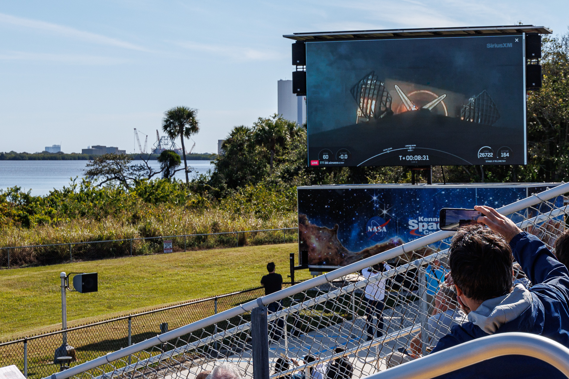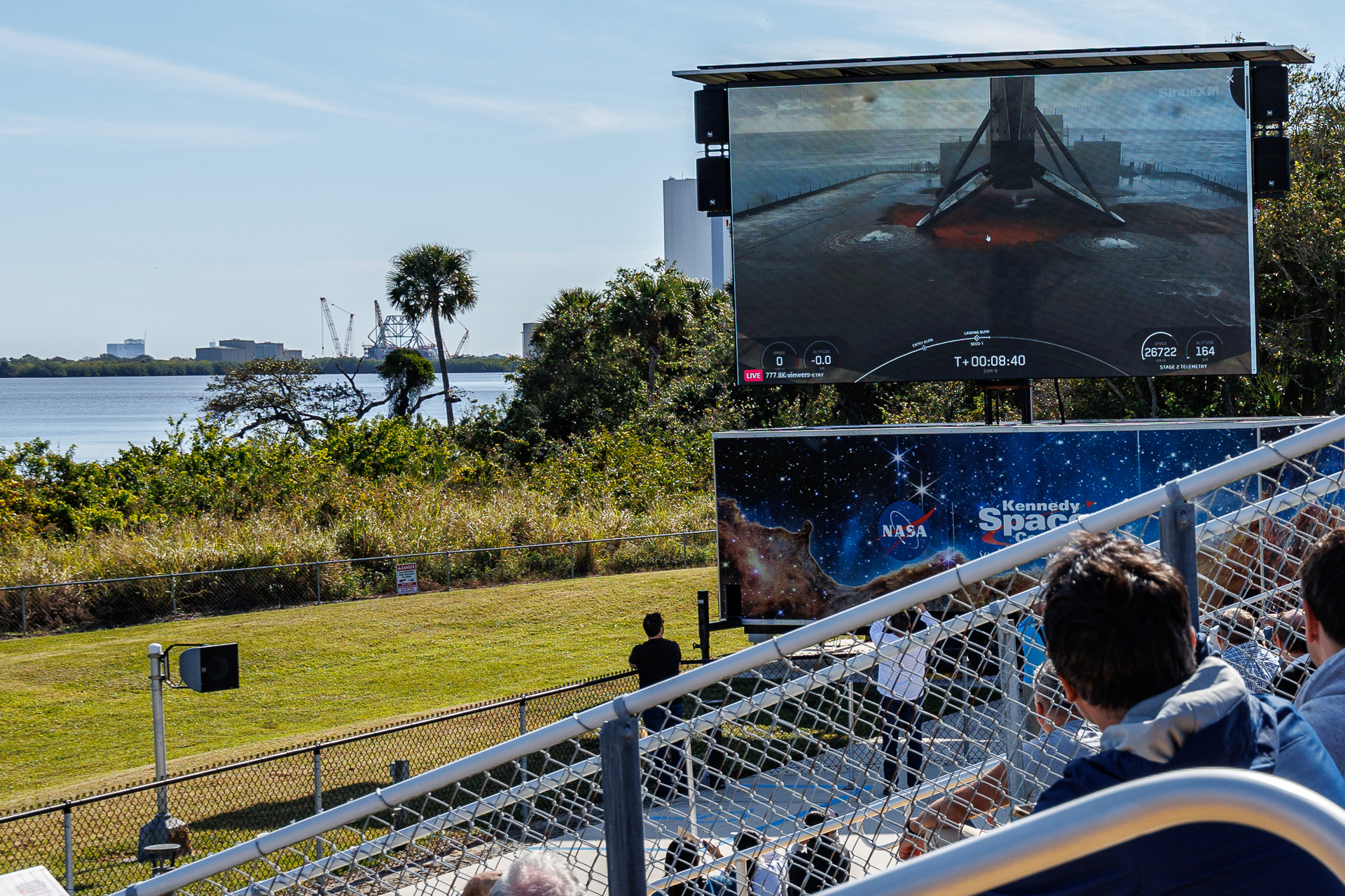 C’est sur les écrans géants situés juste à côté de nous que nous pourrons assister à la récupération du 1er étage qui se fait sur une barge autonome au large. Celle-ci mettra ensuite 2 à 3 jours pour revenir à Cape Canaveral. Là le premier étage n’est plus qu’à 60 km/h en descente, une seconde avant son posé, bien centré sur la barge 👏.