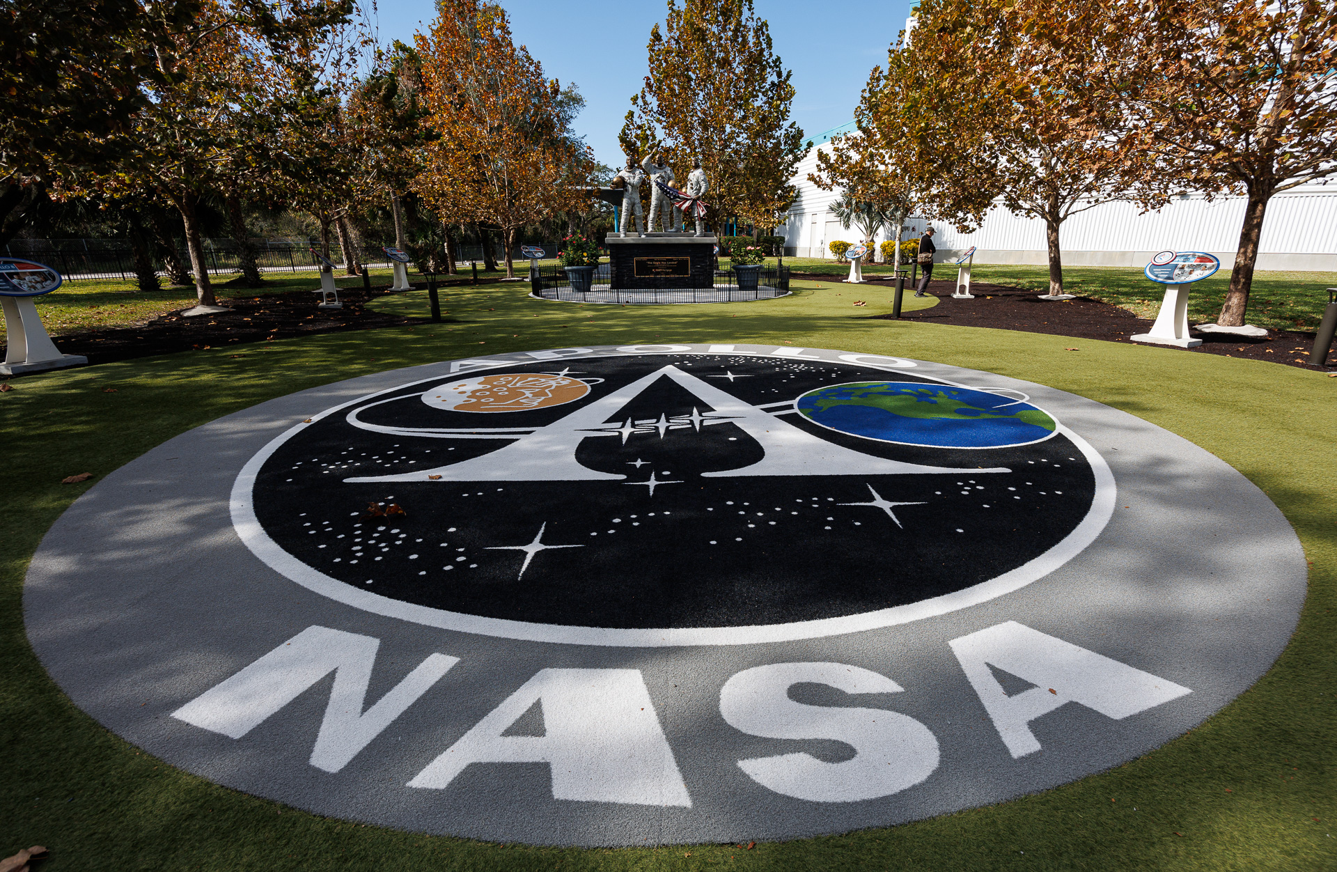 A l’extérieur, le Moon Tree Garden commémore les 17 missions Apollo : une mission, un arbre avec en son centre une sculpture en bronze représentant les 3 astronautes de la mission Apollo 11 qui se sont posés pour la 1ère fois sur la lune le 21 juillet 1969 : Mike Collins, Buzz Aldrin et Neil Amstrong.