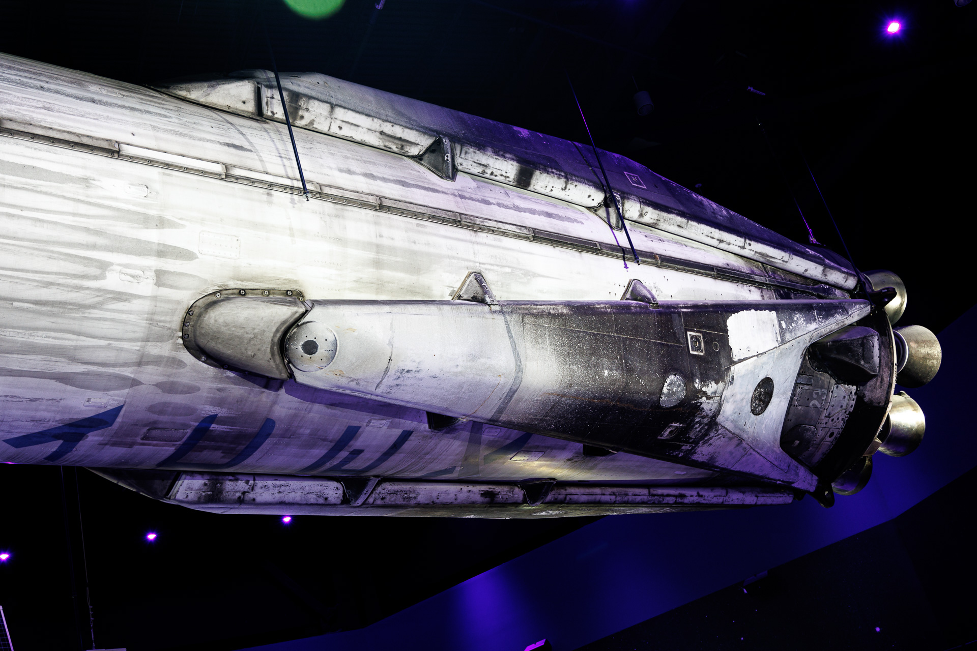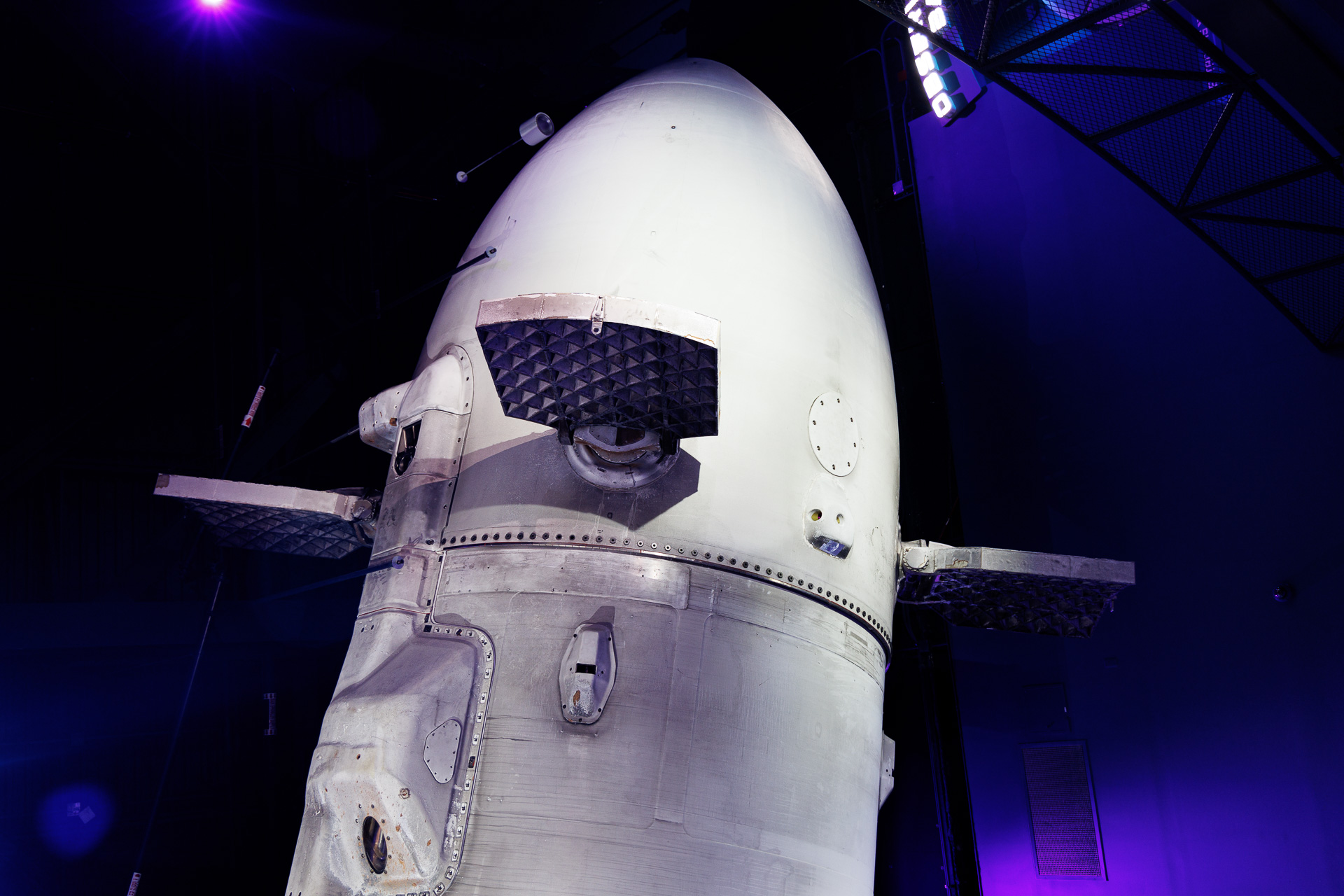 Vue sur le bas de la fusée avec ses 4 pieds repliés.
