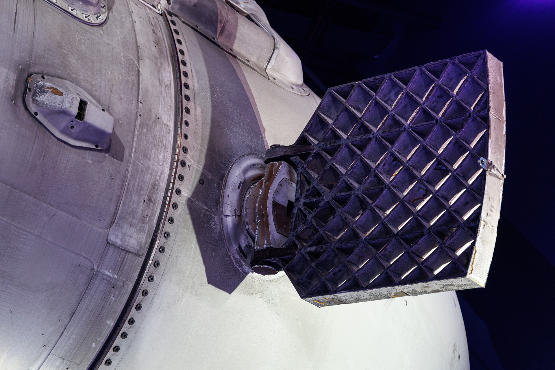 Vue sur la tête d’une fusée Falcon 9 avec les gouvernes qui permettent son retour sur terre et son posé précis en position verticale.