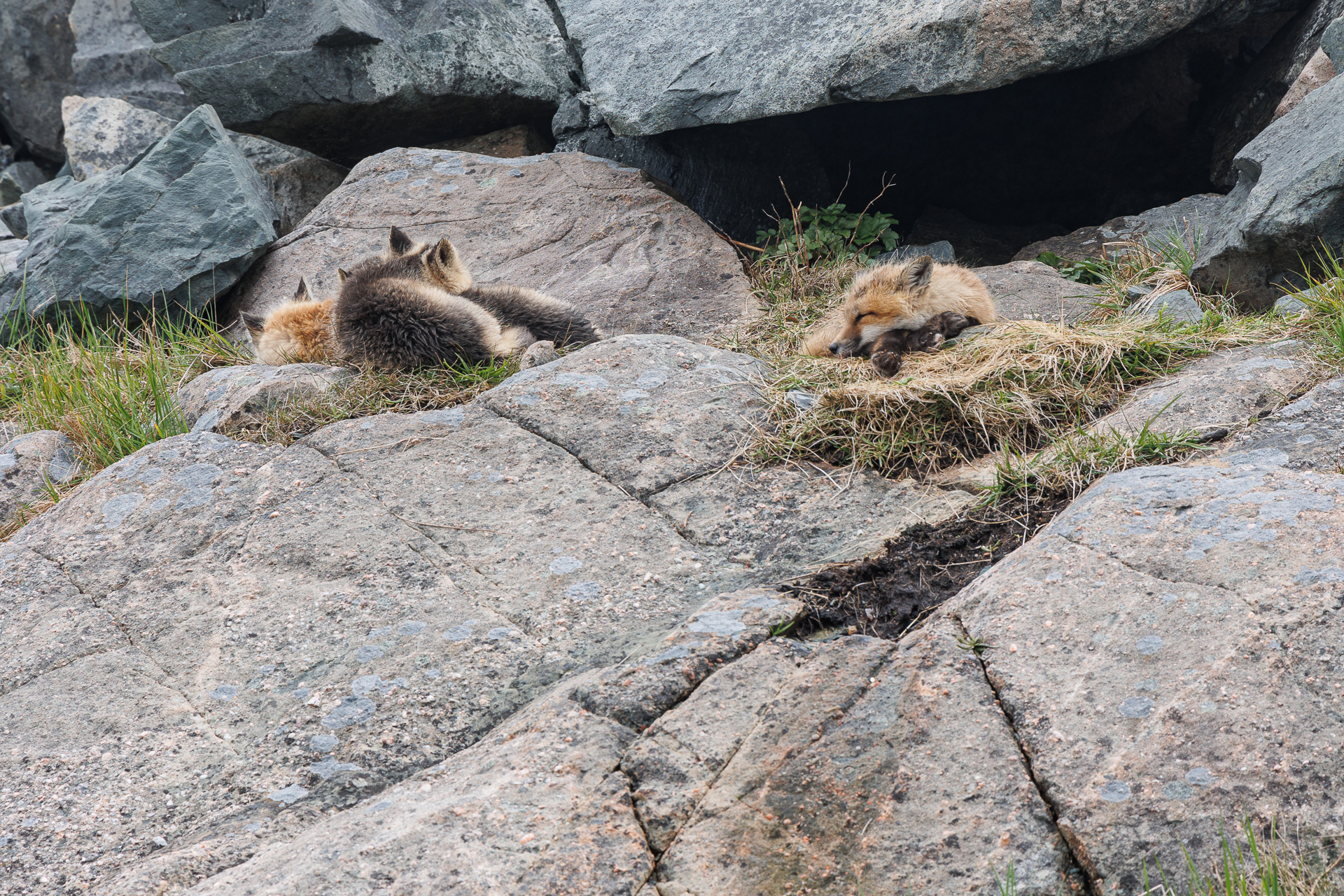 Nous découvrons, avec surprise, 4 renardeaux endormis au pied du phare. Nous les approcherons discrètement afin de ne pas les perturbés, même si la corne de brume, très puissante, juste au dessus ne semble pas les incommoder.