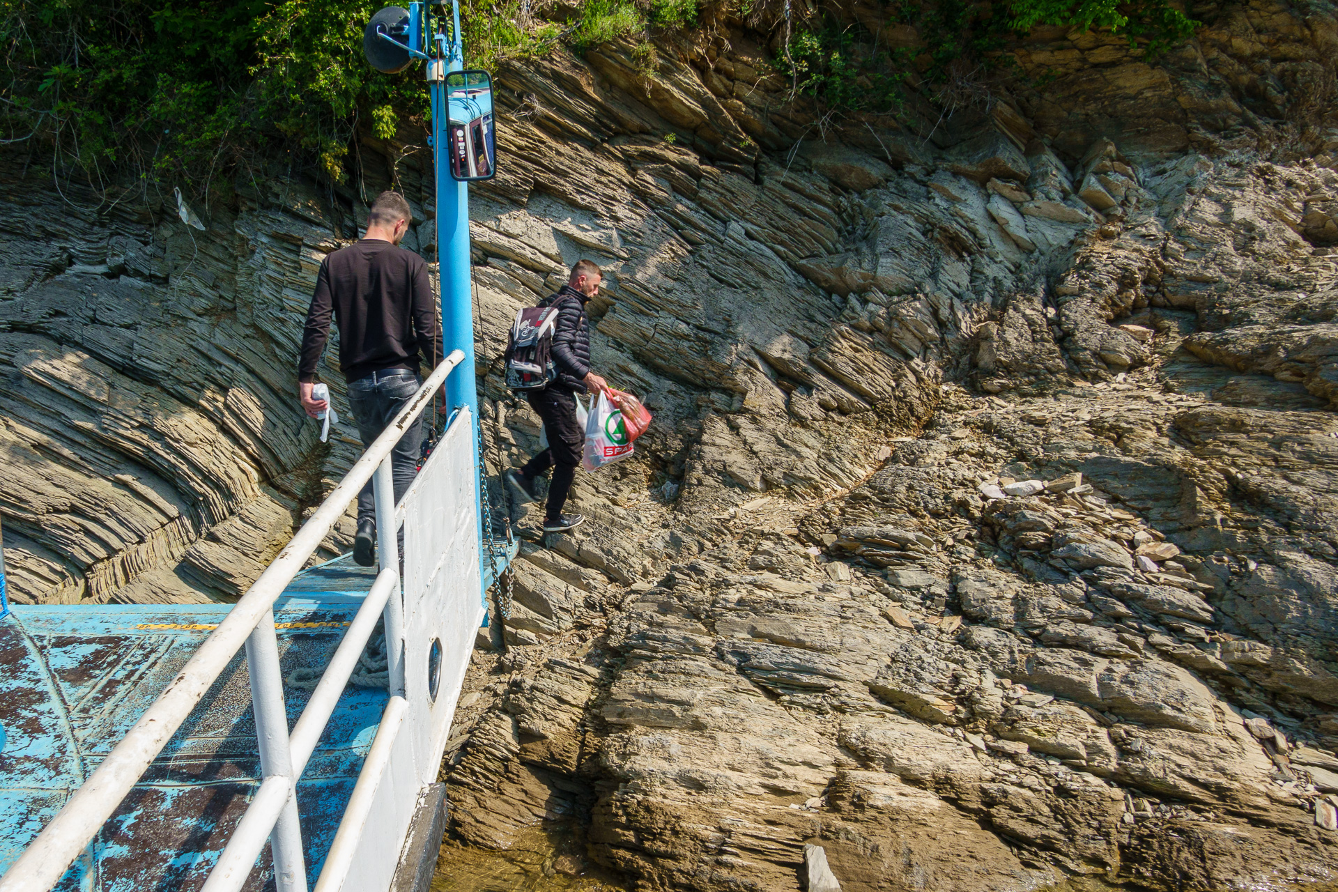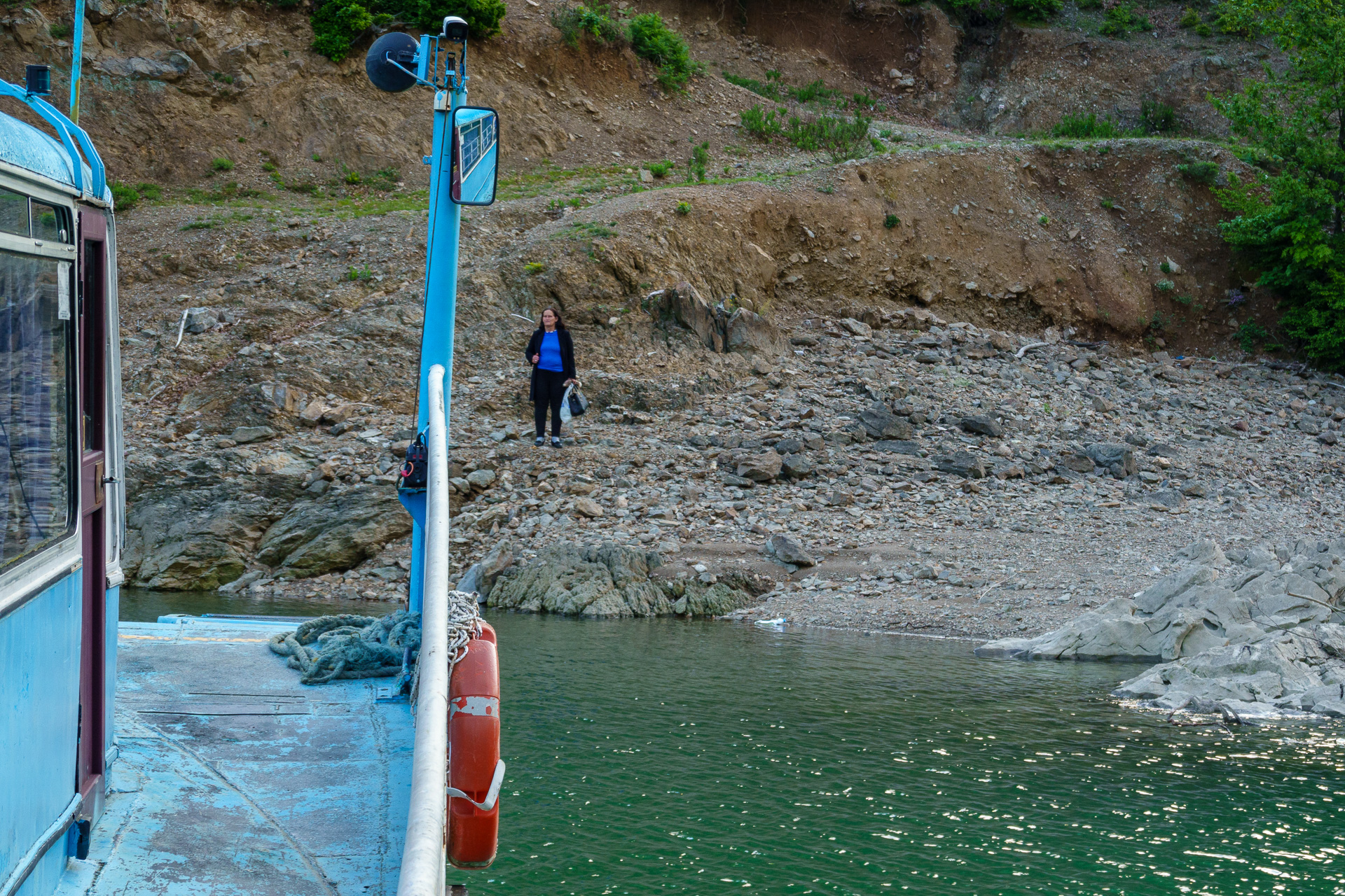 Le bateau s’arrête et dépose un passager avec son sac de courses. Environ un millier de personnes vivent dans ces montagnes, loin de tout. Pour descendre, il suffit de sauter de la passerelle sur le gros rocher et le bateau repart après un arrêt d’environ 2 secondes 😯