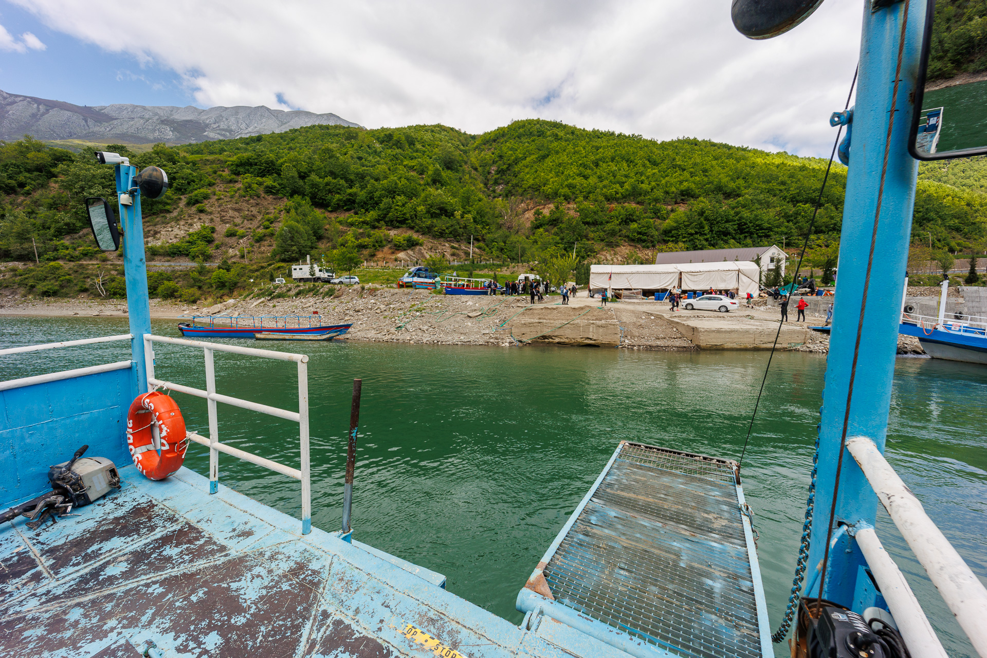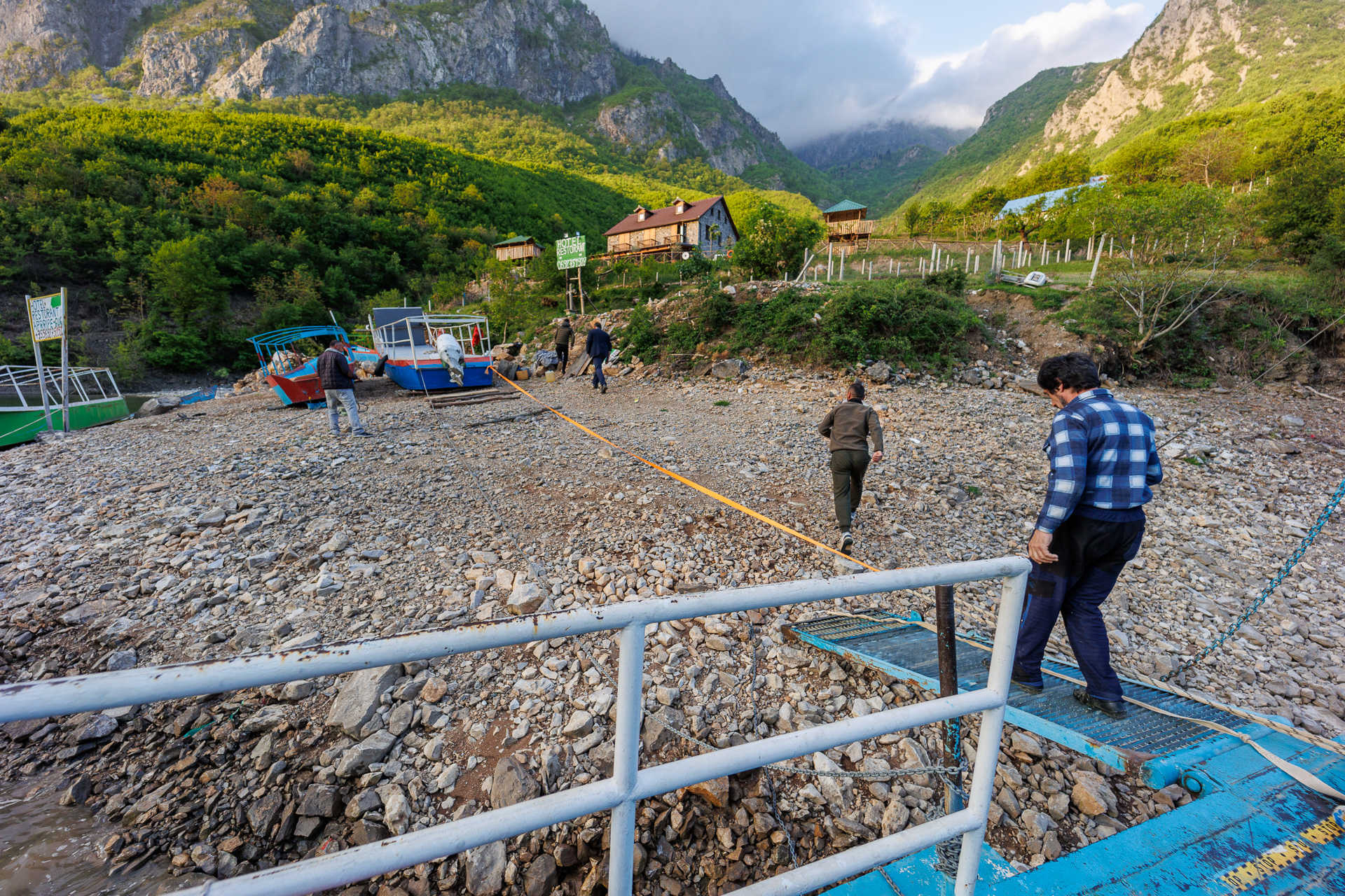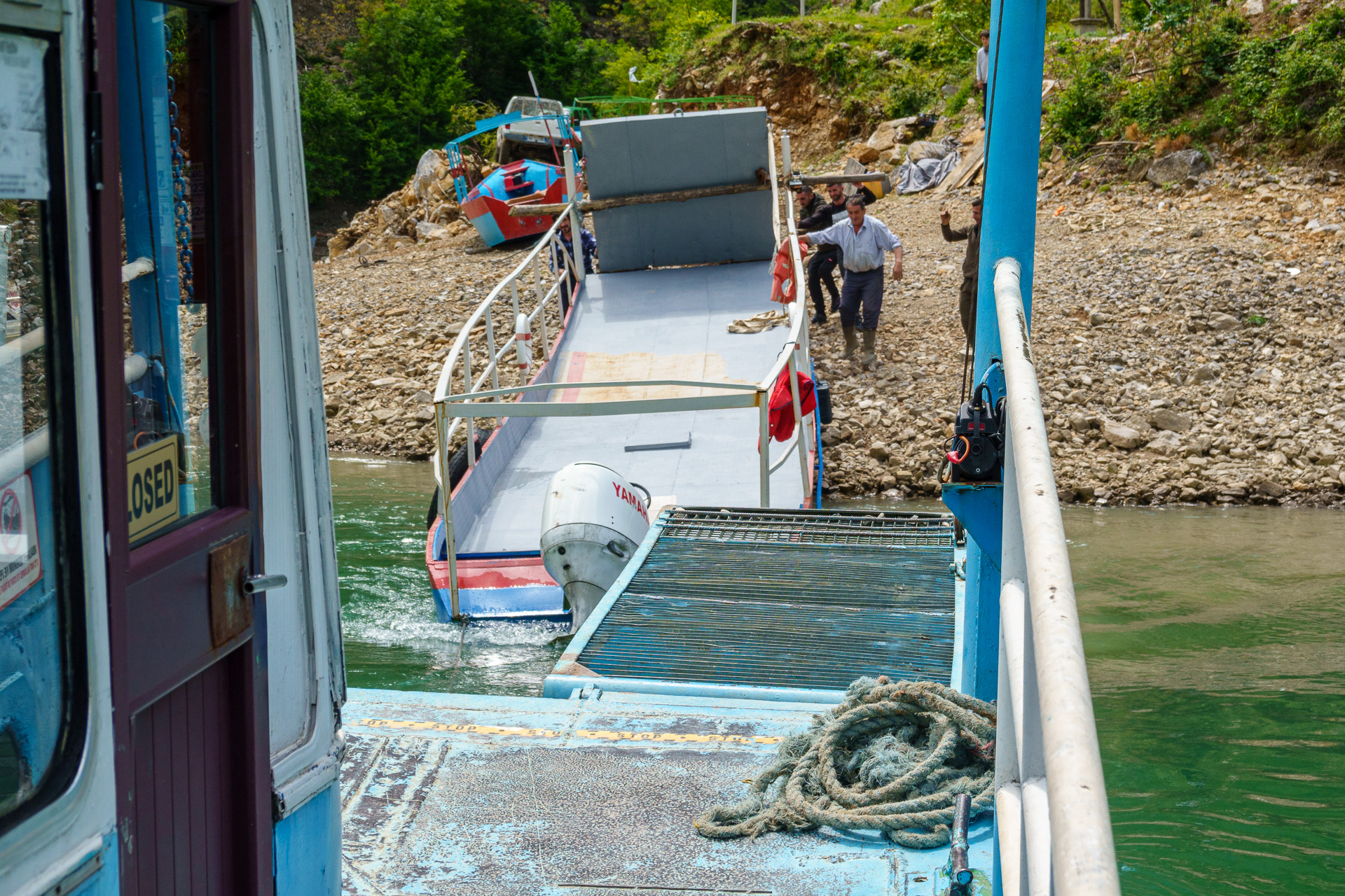 Le ferry transporte les véhicules et les passagers jusqu’à Fierze, notre lieu d’embarquement de ce matin. Il fait aussi quelques haltes dans le même style que les nôtres.