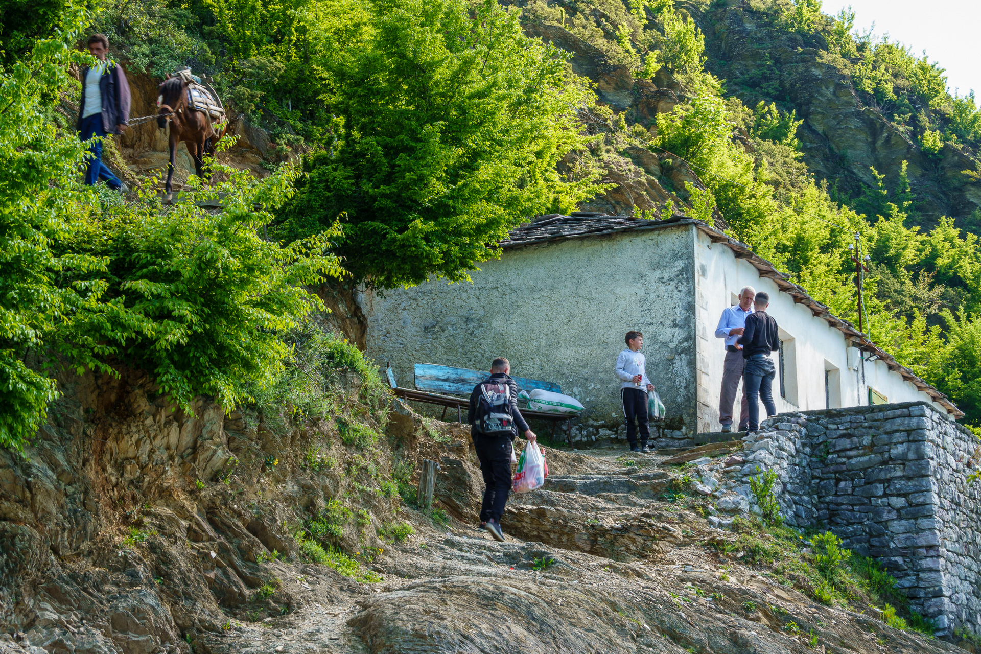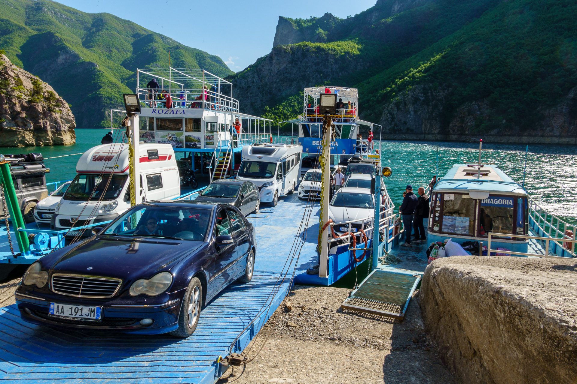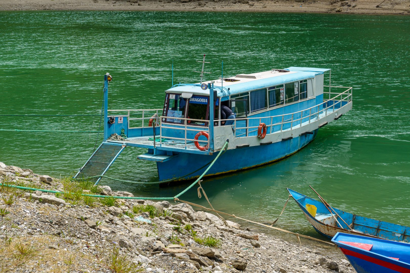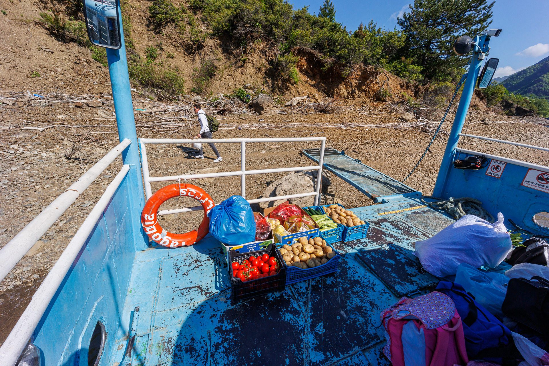 Le ferry transporte les véhicules et les passagers jusqu’à Fierze, notre lieu d’embarquement de ce matin. Il fait aussi quelques haltes dans le même style que les nôtres.