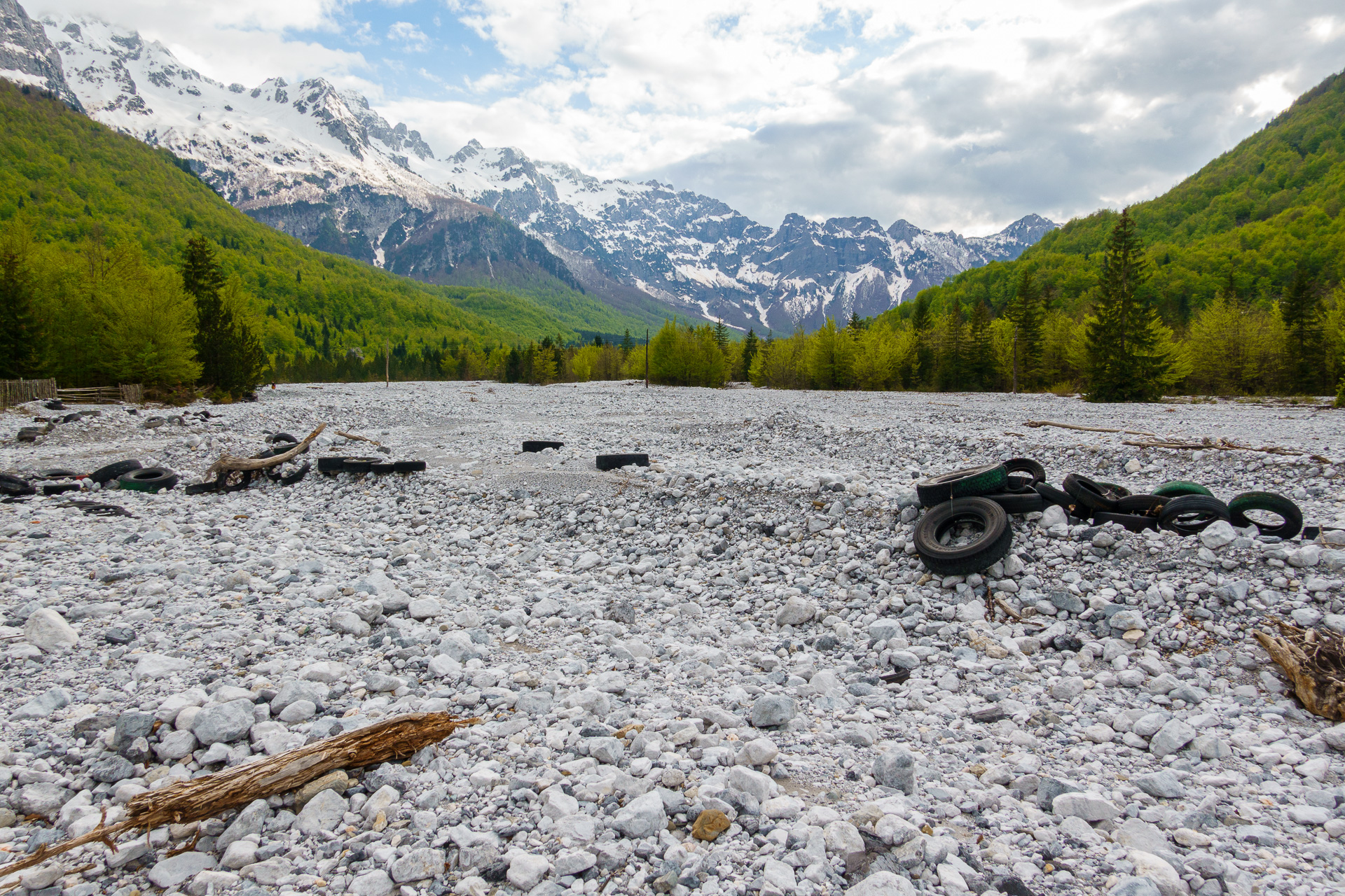 Demain, nous irons faire une petite randonnée au milieu de ce paysage grandiose. En attendant, nous nous promenons dans le lit de la rivière, très large. Quel dommage que ce beau paysage soit souillé par tous ces pneus !