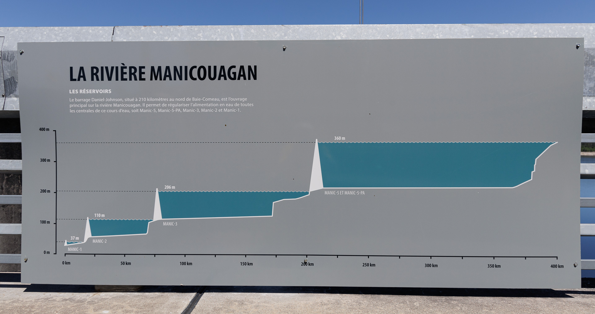 Il y a 4 centrales successives sur le cours de la rivière Manicouagan : Manic-1, Manic-2, Manic-3 et Manic-5. L’ensemble s’étale sur 400 kilomètres. Manic-4 ne sera jamais construite.
