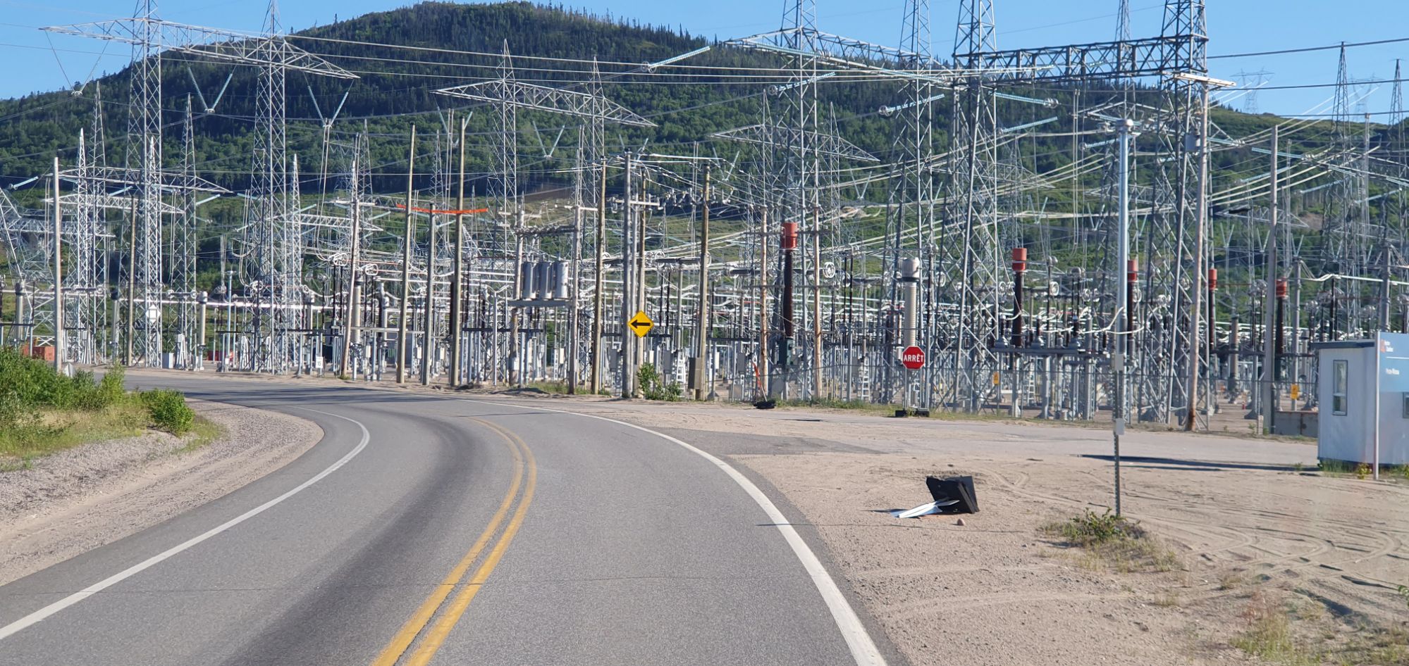 Nous quittons le site pour retourner sur la rive du Saint-Laurent. La centrale génère une tension alternative de 13,8 kilovolts (kV) qui après avoir traversé un transformateur élévateur augmente à 315 kV. Celle-ci est ensuite augmentée à une valeur de 735 kV après élévation au poste de Micoua qui est le poste collecteur de plusieurs centrales : Manic-5, Manic-5 PA, Manic-3, Outarde 3, Tounoulstouc et Churchill Falls.