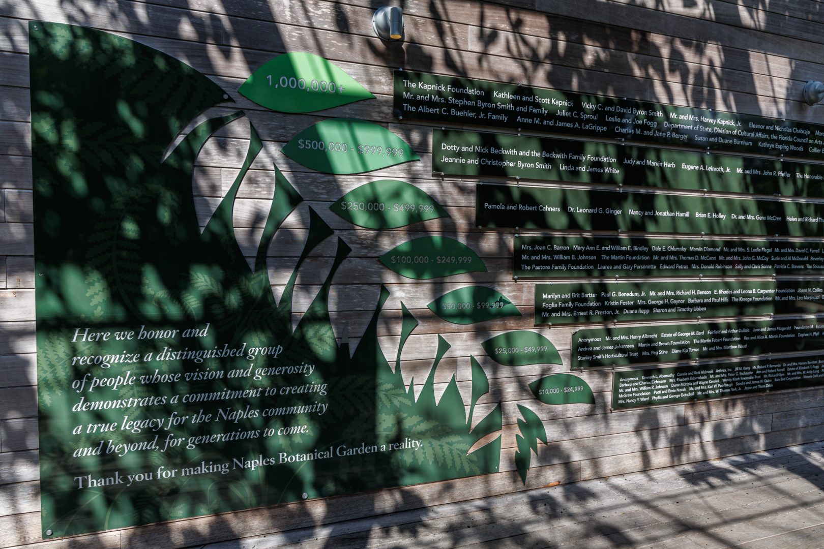 Le jardin botanique a été créé en 1993 grace à des dons privés. Ce tableau affiche les sommes données par chaque donateur. Aux États-Unis, les donations privées sont trés courantes et illustrent une tradition culturelle bien ancrée. Alexis de Tocqueville, homme politique et écrivain français du 19ème siècle, lors de son voyage aux États-Unis de 10 mois en 1831, avait déjà fait cette constatation : « les Américains de tous les âges, de toutes les conditions, de tous les esprits, s’unissent sans cesse (…).