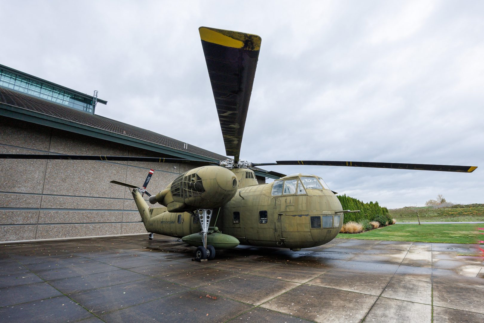 Nous passons à côté de cet impressionnant hélicoptère Sikorsky CH-37B Mojave (1953), l’un des plus grands hélicoptères à moteurs à pistons jamais construits (2 x 2100 chevaux, 14 tonnes (le poids du camion 🫢) au décollage, 209 km/h). Particularité : les moteurs et le train d’atterrissage rétractable sont logés dans des nacelles sur les côtés, libérant une grande soute de chargement, accessible par 2 grandes portes frontales.