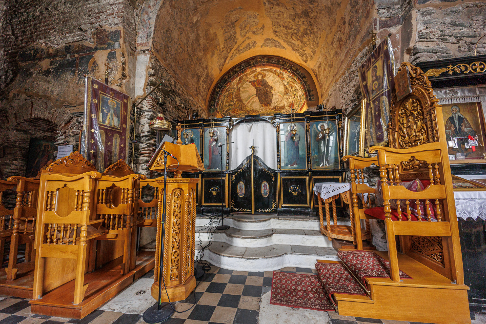 Elle possède de rares fresques du 12ème siècle. La mosaïque du Christ, au-dessus de l’autel, date du 5ème siècle.