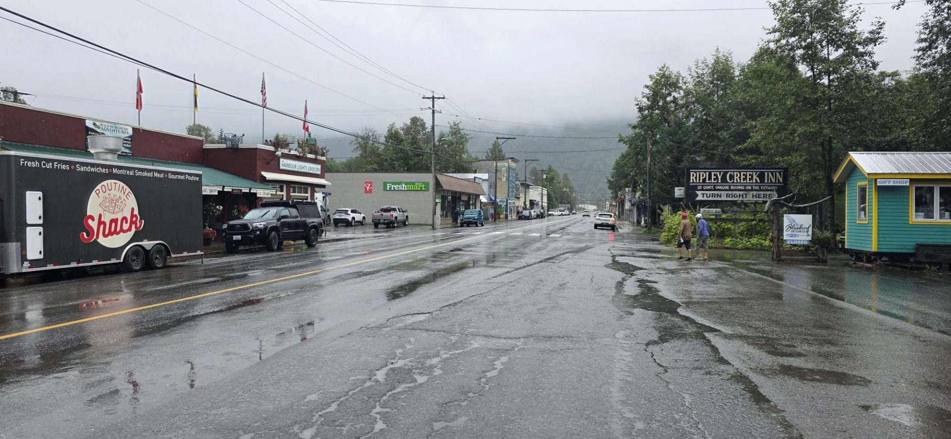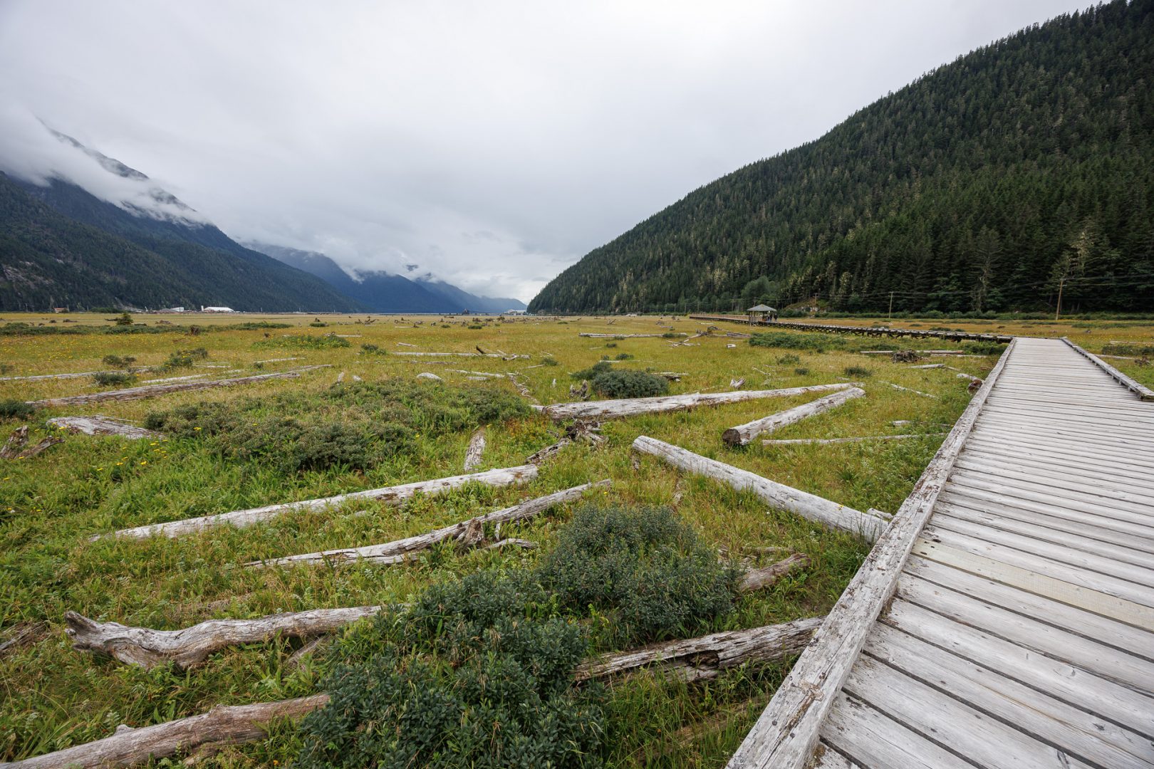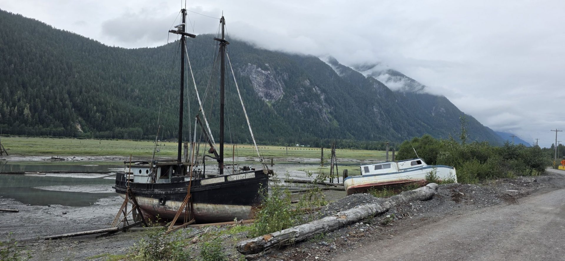 Par fortes marées (Stewart se trouve au bout du canal de Portland qui se jette dans le Pacifique Nord), les troncs d’arbres arrivent jusqu’aux portes de la ville. Les États-Unis se trouvent juste au bout de la montagne à droite !