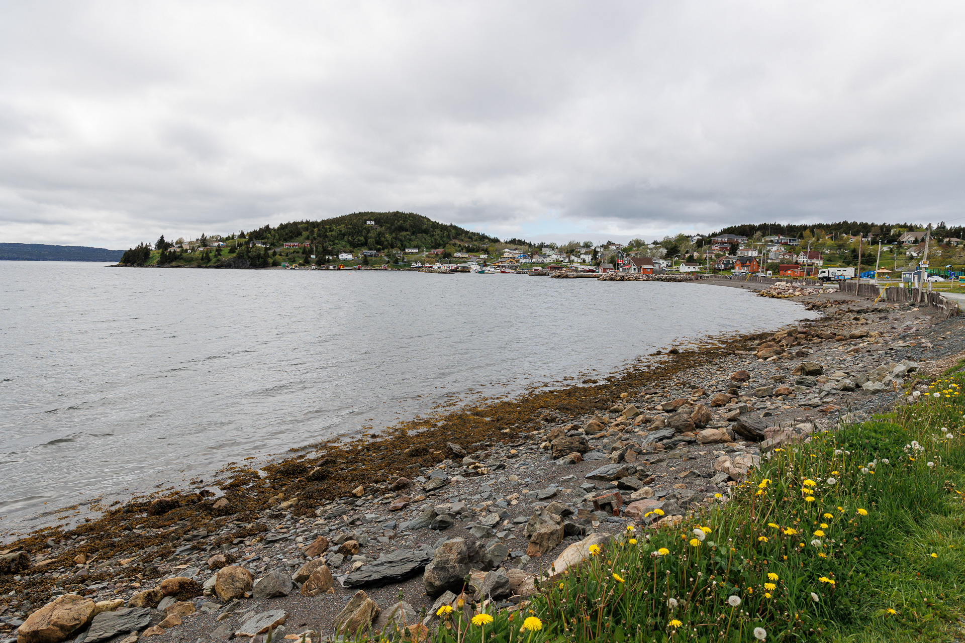 La plage de Dildo et la colline, au loin, qui rappelle un moment humoristique de la ville.