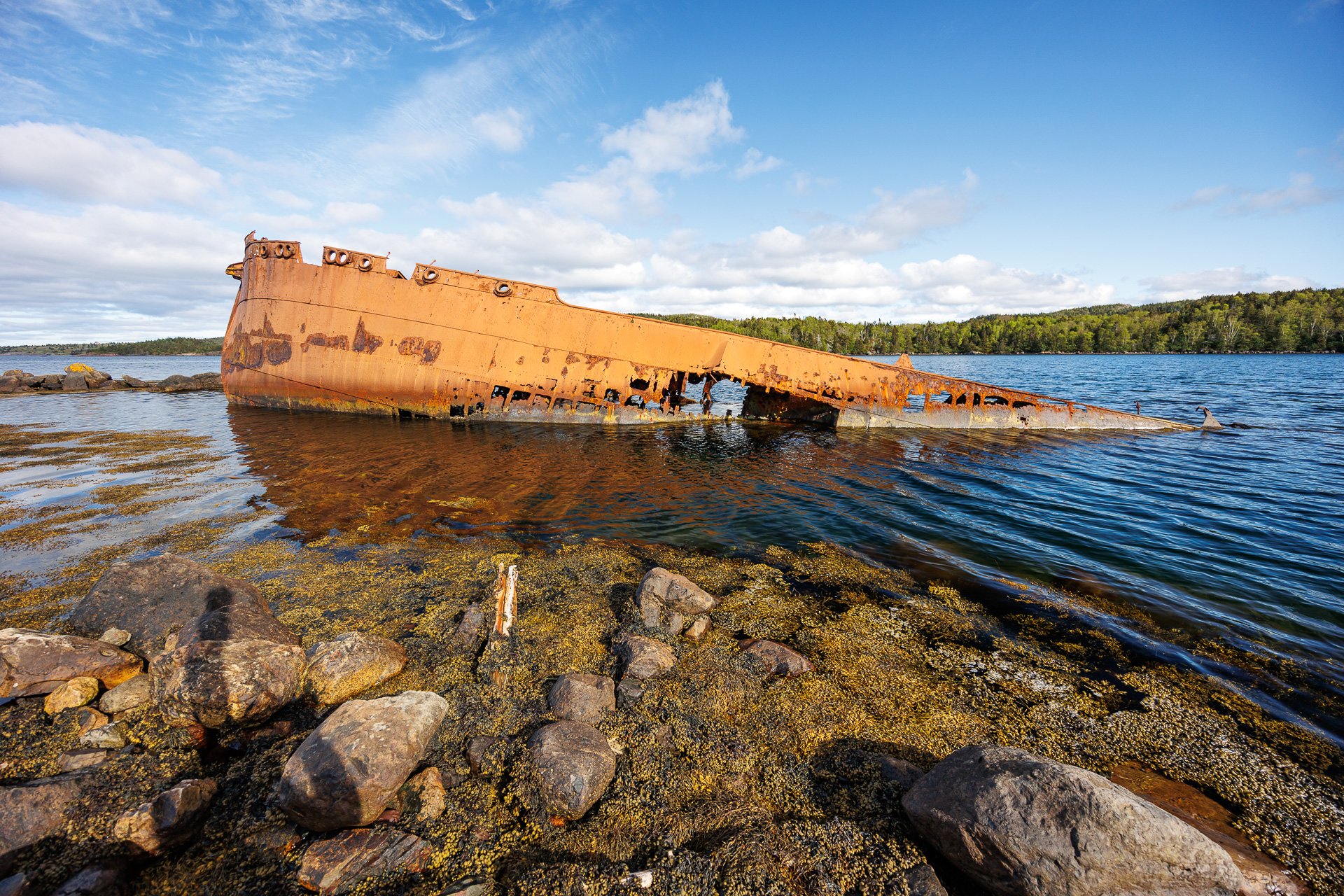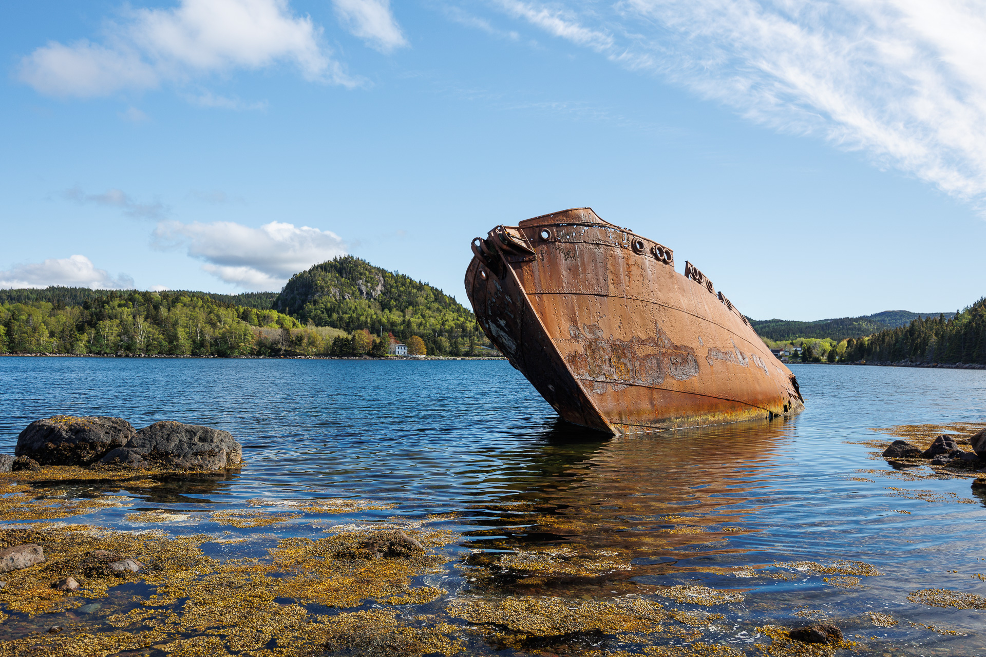 Nous nous arrêtons ensuite à Conception Harbour pour photographier l’épave d’un baleinier, le SS Charcot, qui a coulé dans le port en 1968 après avoir rompu ses amarres.