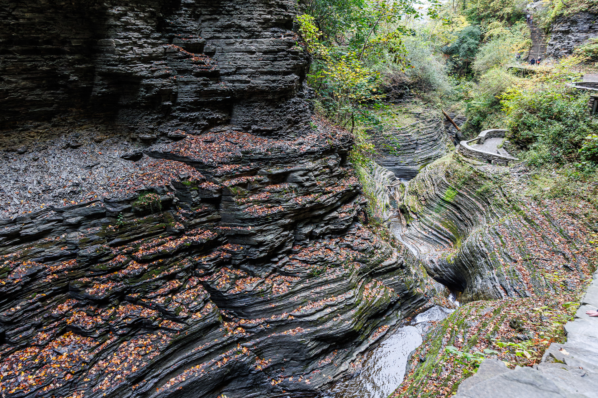 Les roches de la région sont des sédiments de l’âge du Dévonien, faisant partie d’un plateau disséqué qui a été soulevé avec peu de failles ou de distorsions. Elles sont principalement constituées de schistes tendres, avec quelques couches de grès et de calcaire plus durs, ce qui donne ces belles ondulations !