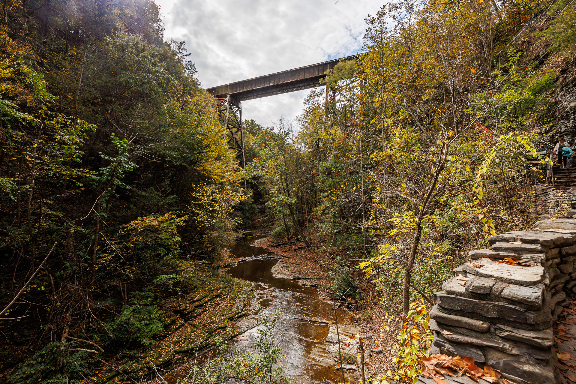 Un pont de chemin de fer franchit cette gorge à son extrémité supérieure.