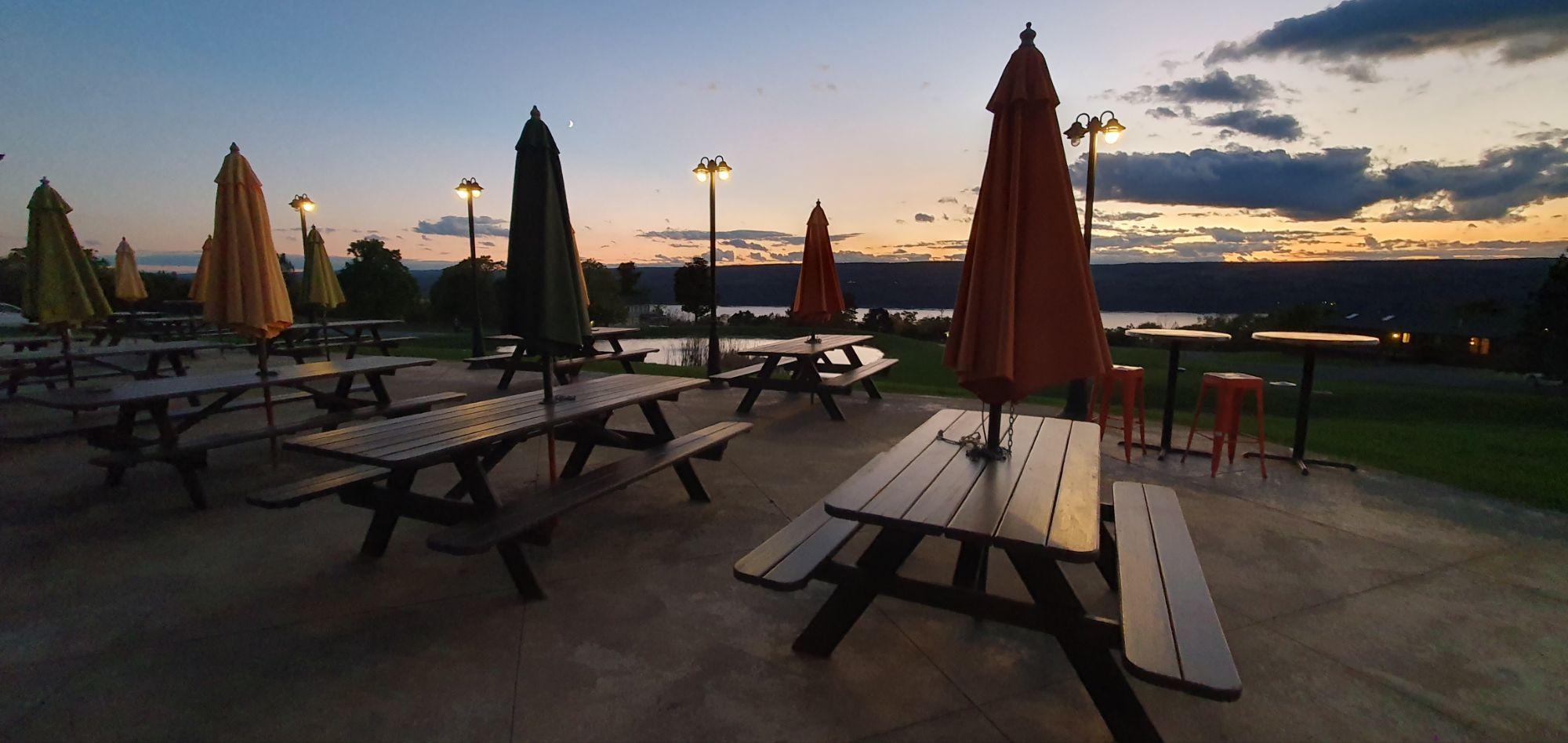 Notre balade s’achève avec cette belle vue sur la terrasse et le lac au coucher de soleil.