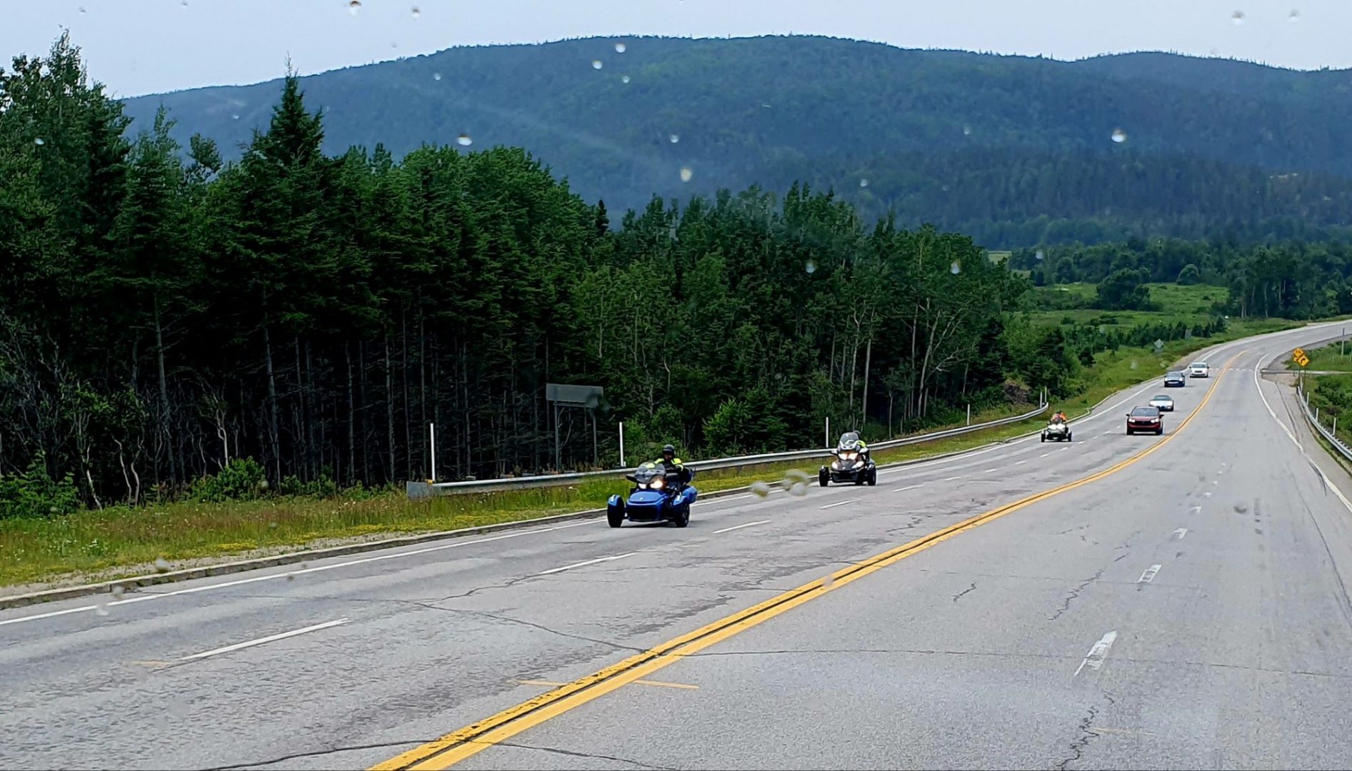 Sur la route, nous croisons tres souvent des tricycles motorisés. Il y en a beaucoup au Canada, plus que des motos. Peut-être est-ce dû à l’état des routes qui n’est pas très engageant pour les motos : trous, chaussées fortement déformées, …