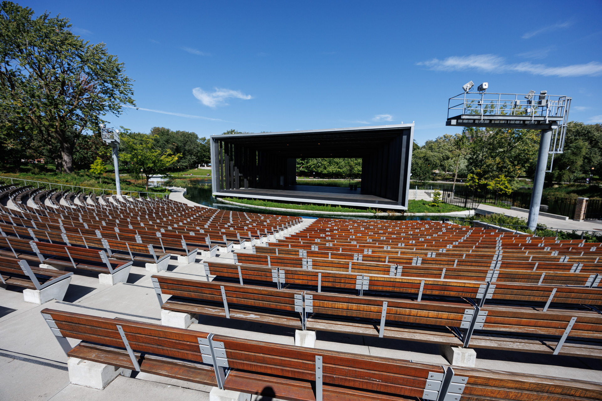 En le traversant, nous découvrons un théâtre de verdure qui nous rappelle un peu le théâtre du Peuple de Bussang (Vosges). La scène est ouverte sur la nature… Les sapins sont remplacés par les érables et le gazon 😜. Des spectacles de danse, de musique, de cirque et de théâtre ainsi que des films sont présentés, durant la saison estivale, dans cet amphithéâtre extérieur de 2000 places.