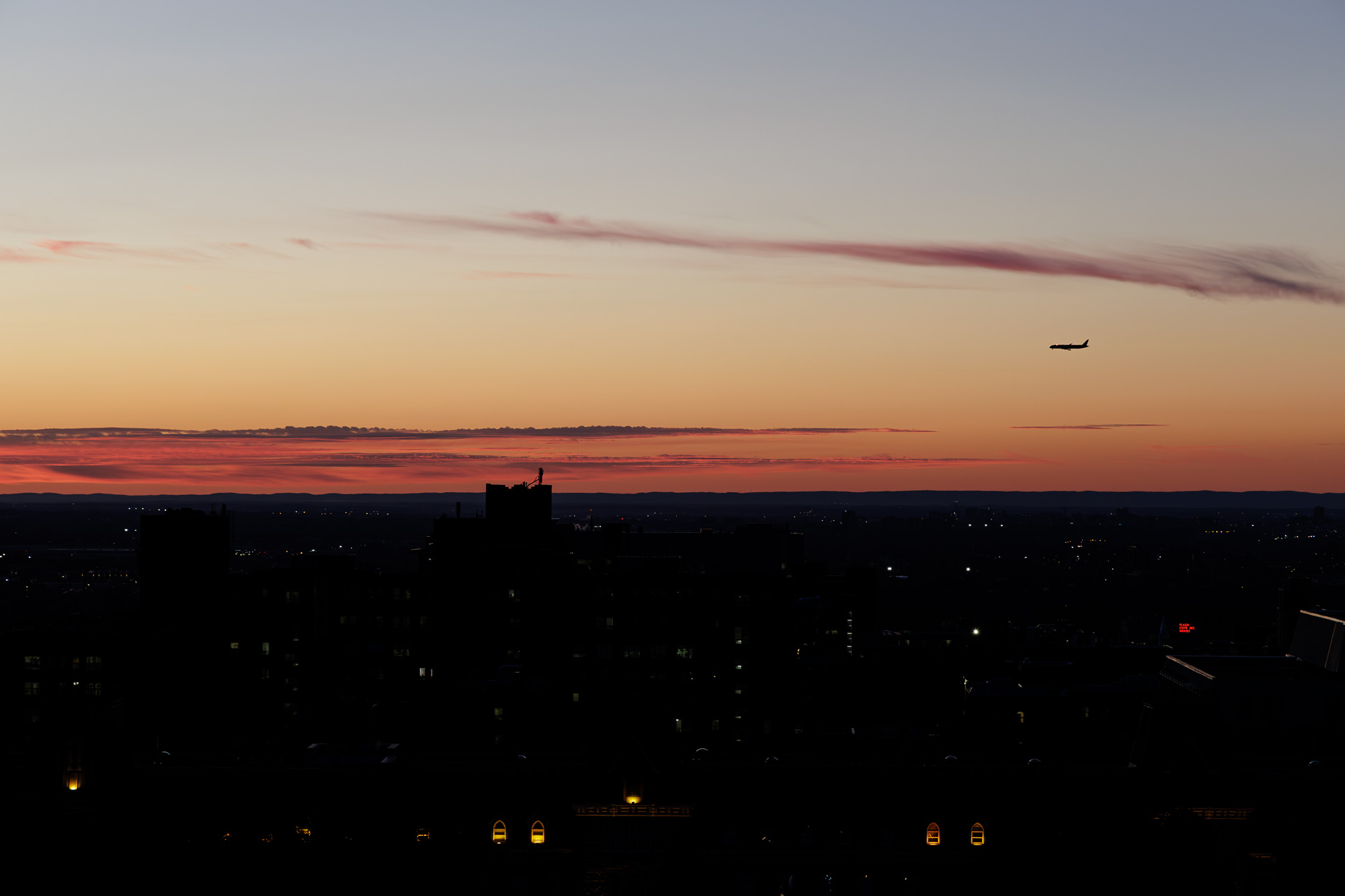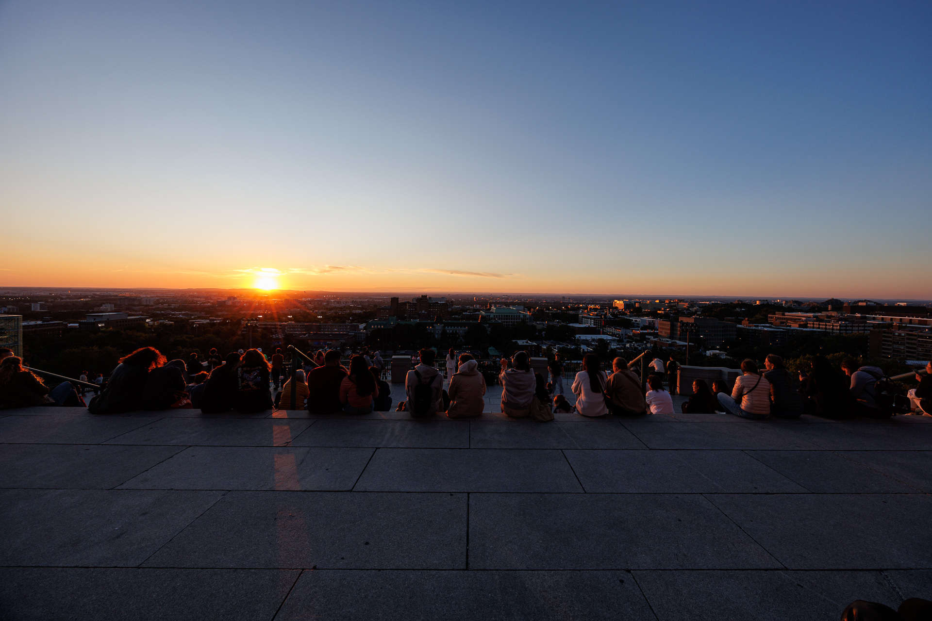 Les spectateurs sont déjà là ! Ils ne sont pas trop nombreux… ouf ! Nous assistons à un coucher de soleil magnifique sur la ville de Montréal 🤩 !