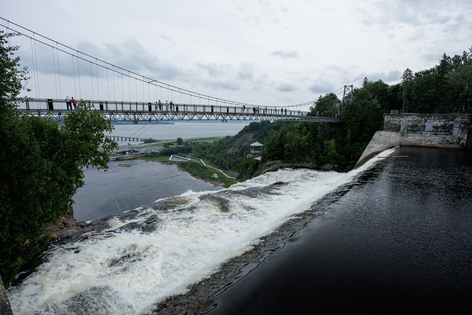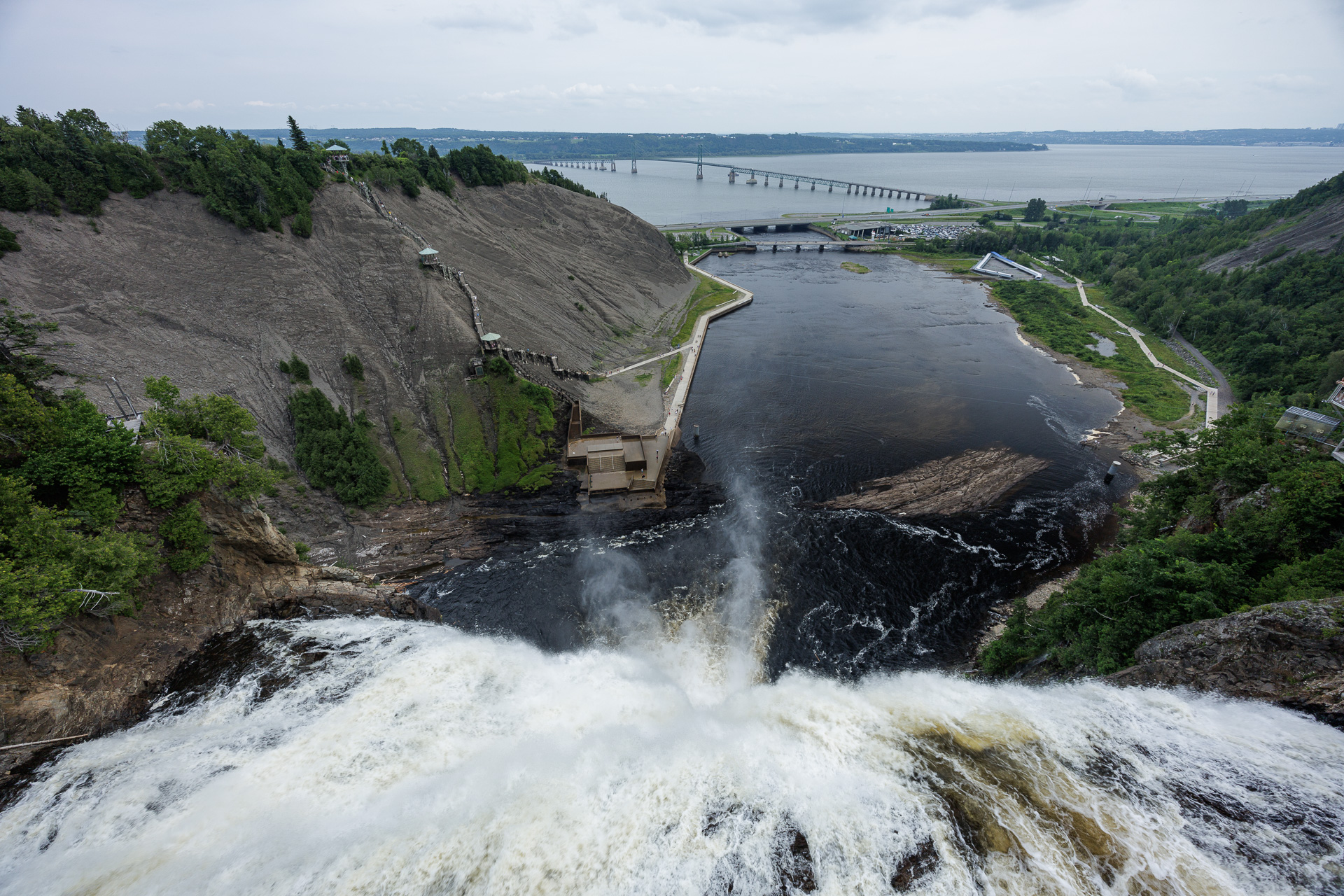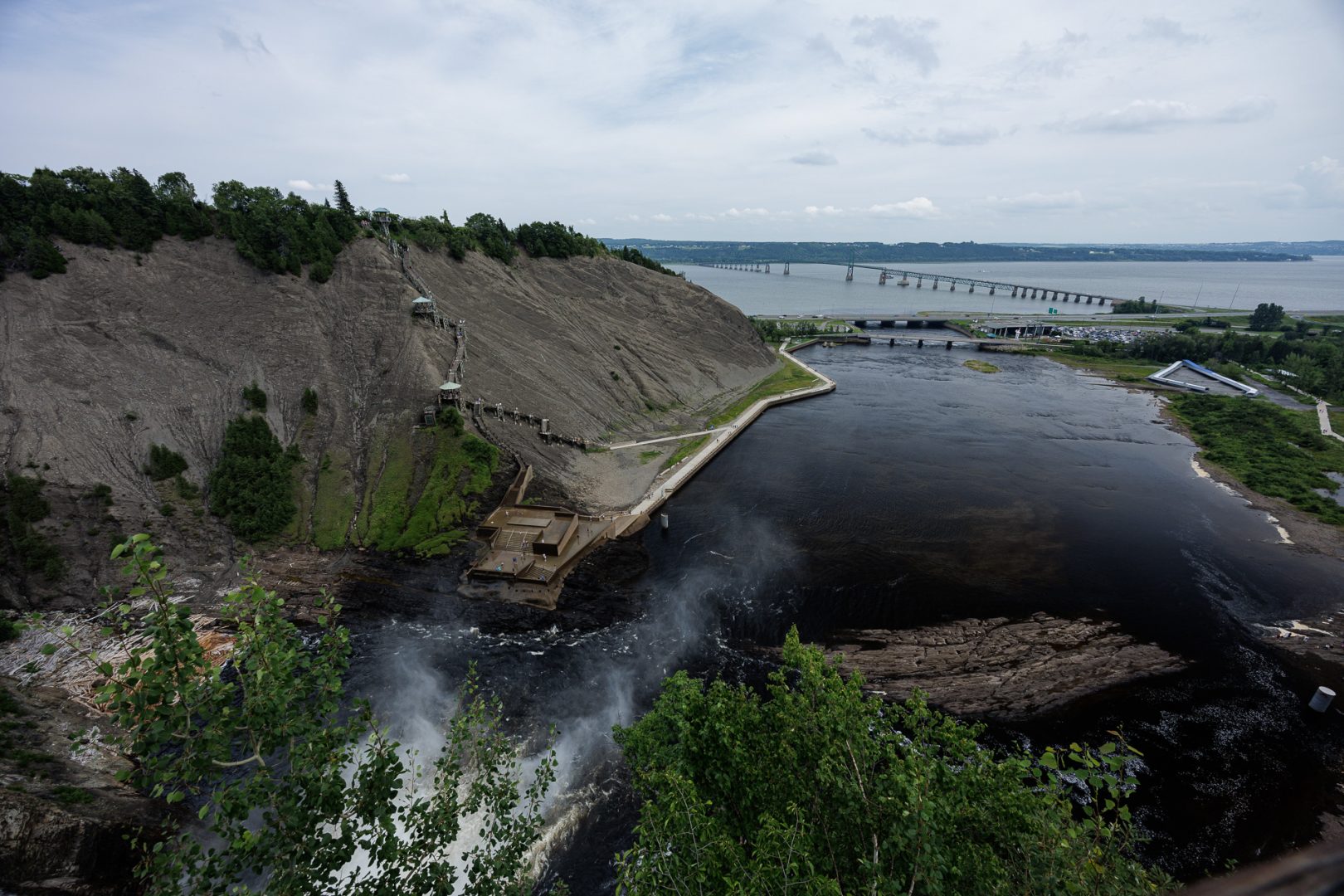 Depuis la passerelle, nous avons une belle vue sur la cascade avec le fleuve St Laurent au loin et le pont qui relie la province à l’île d’Orléans.