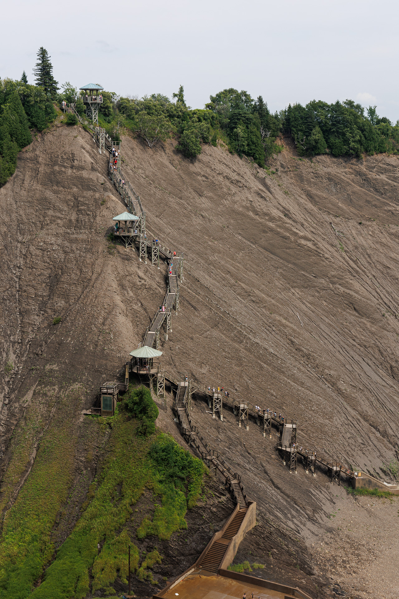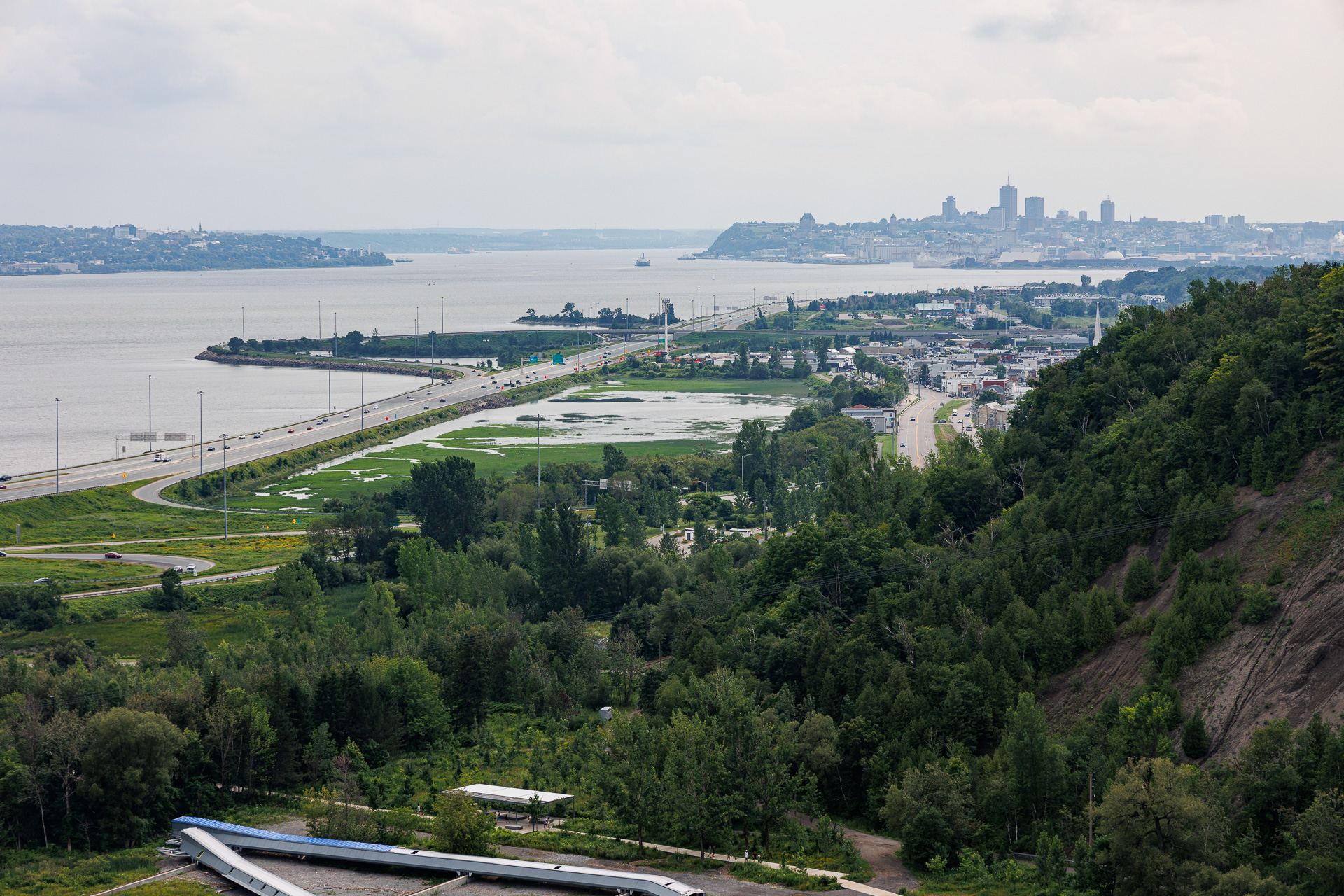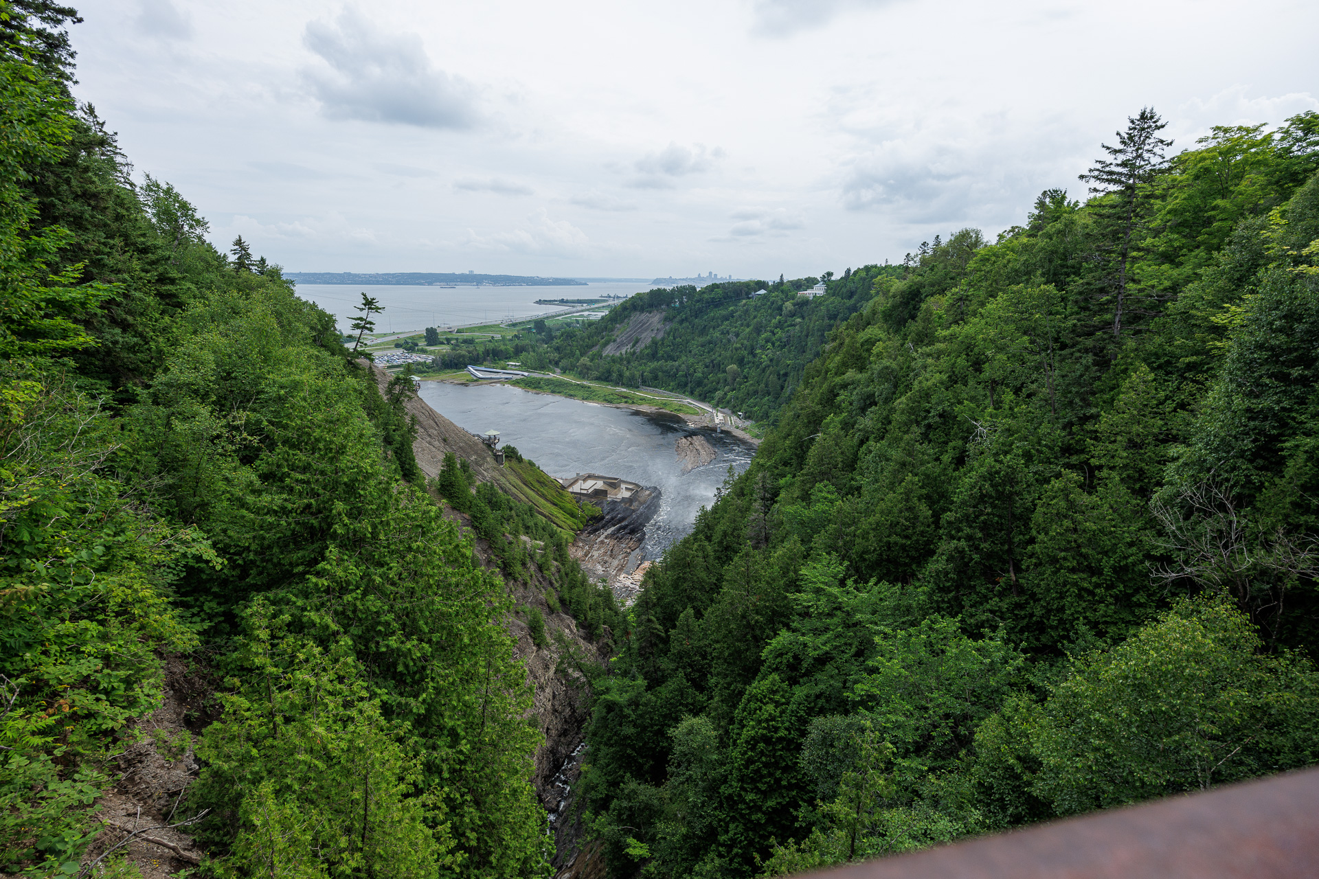 Depuis la passerelle, nous avons une belle vue sur la cascade avec le fleuve St Laurent au loin et le pont qui relie la province à l’île d’Orléans.