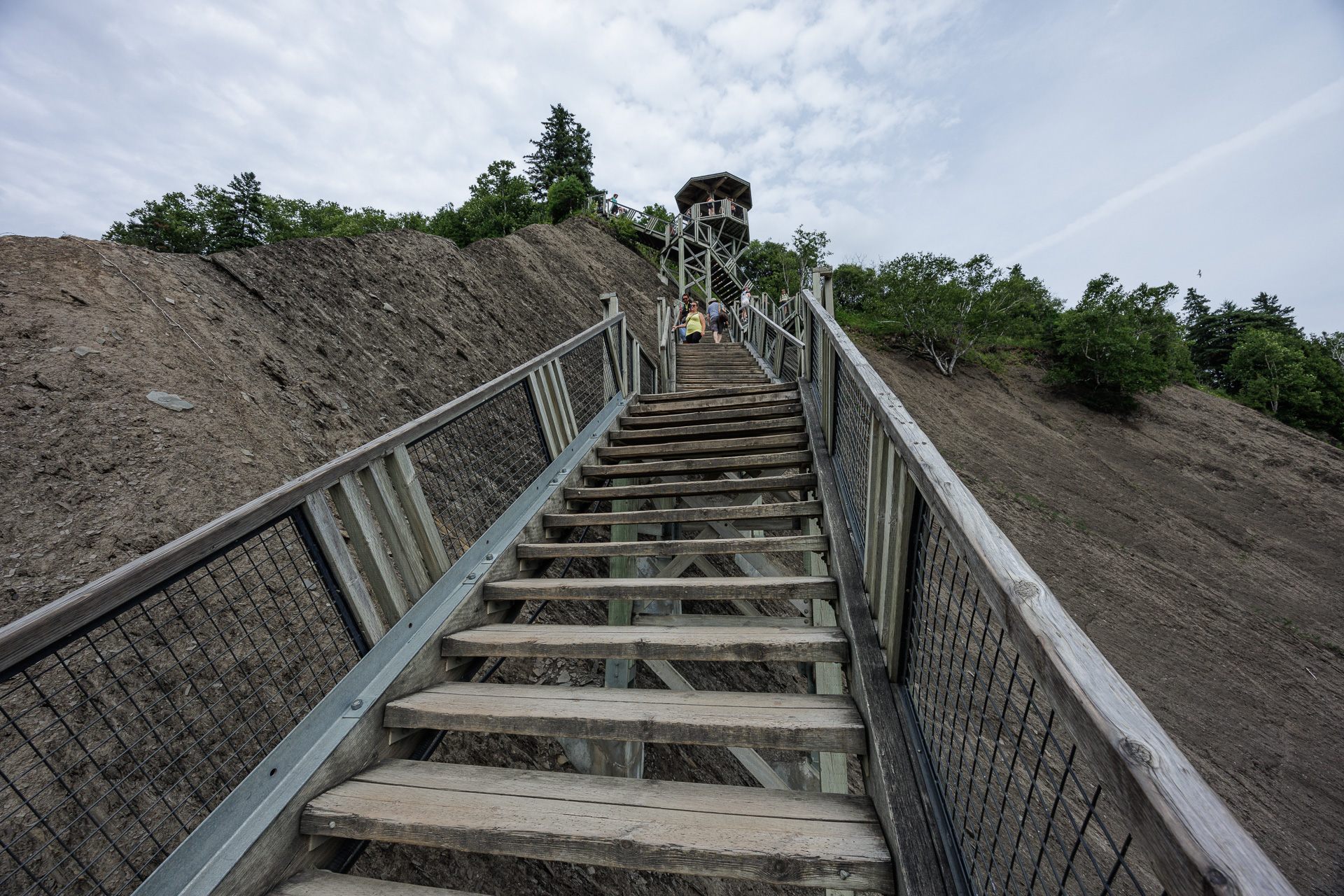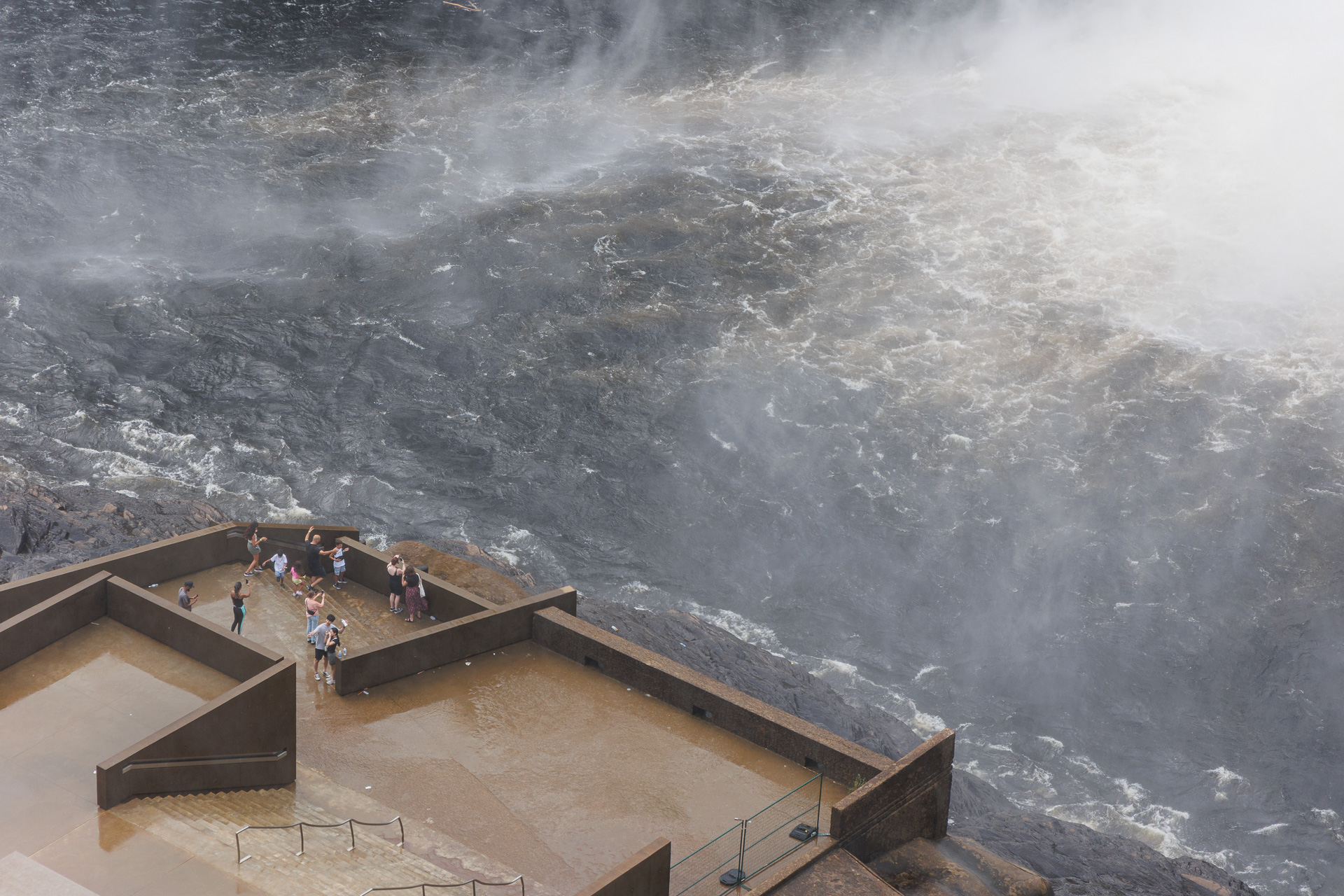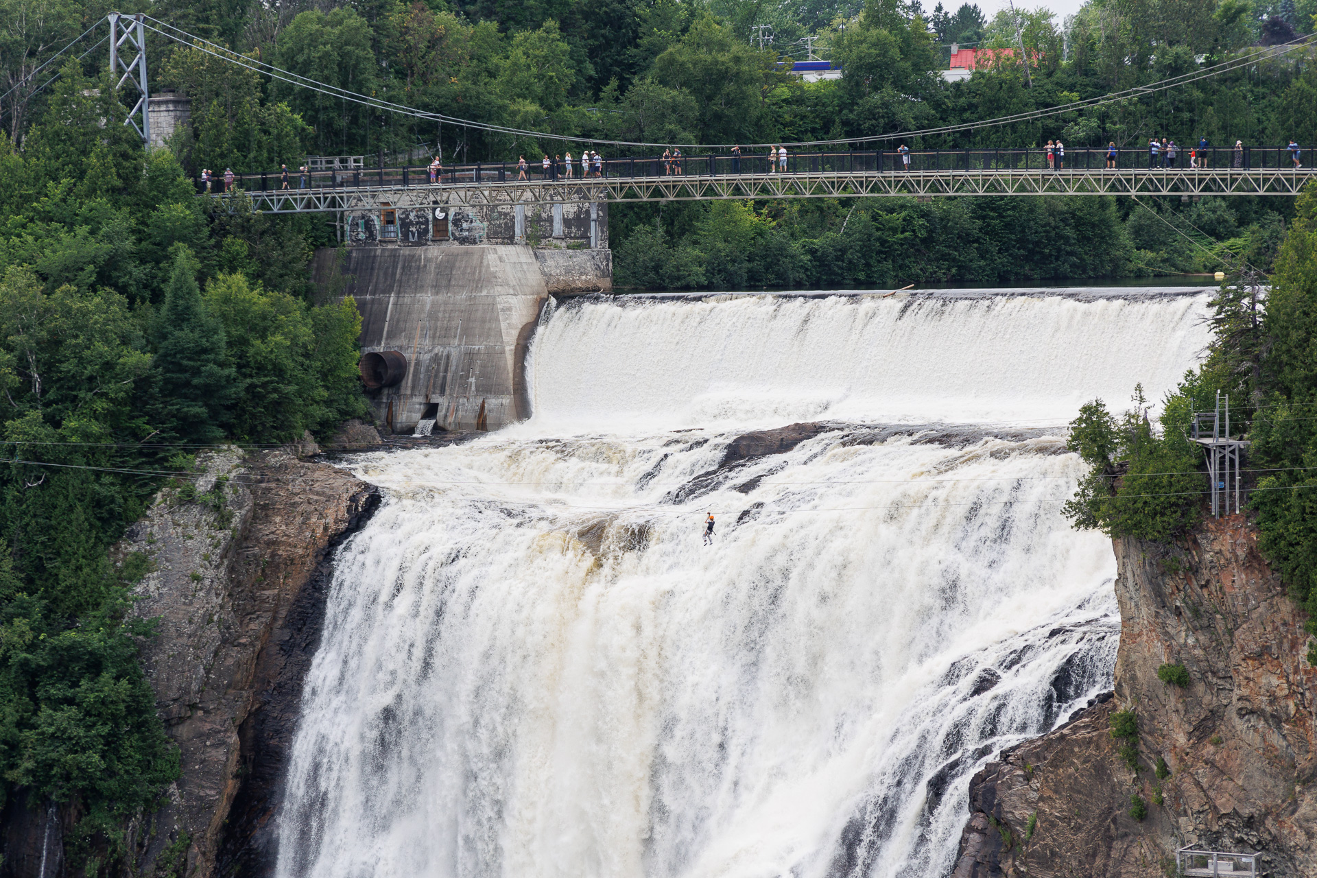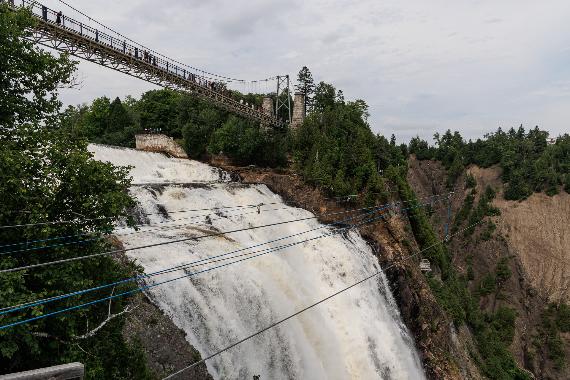 Quelques intrépides iront voir la chute de plus près avec la tyrolienne (un est visible sur la photo 😯). Nous, on préfère les regarder depuis les escaliers !
