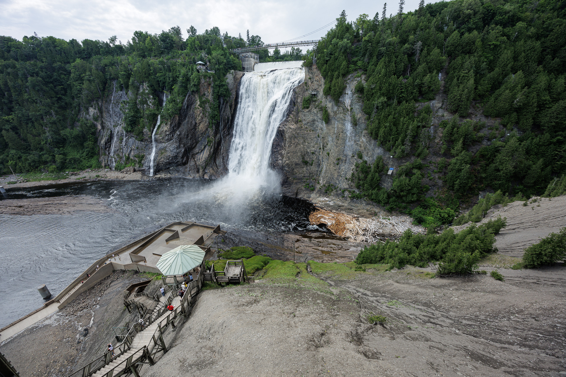 Depuis les escaliers, une autre vue sur les chutes. Curieusement les troncs d’arbres s’agglutinent au pied de la cascade (sur la droite)