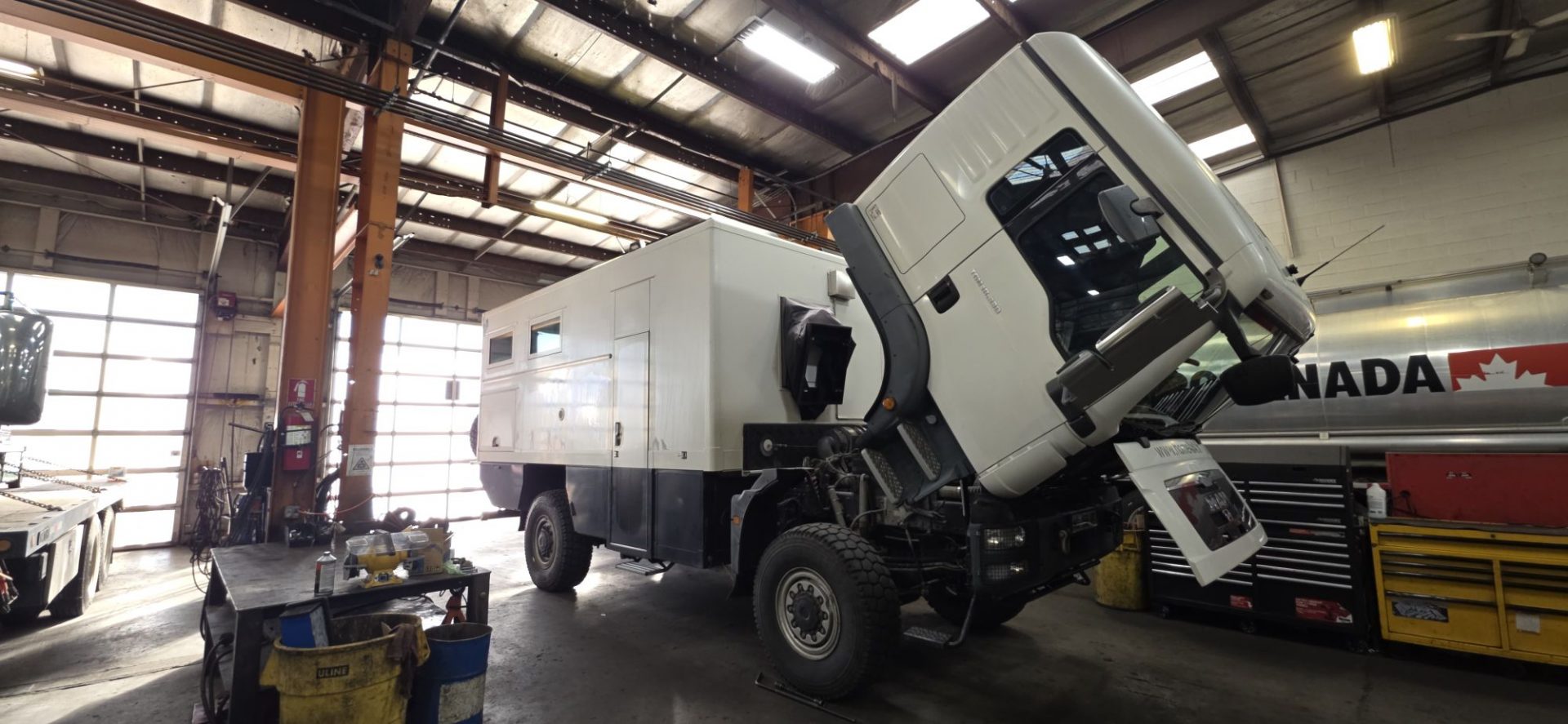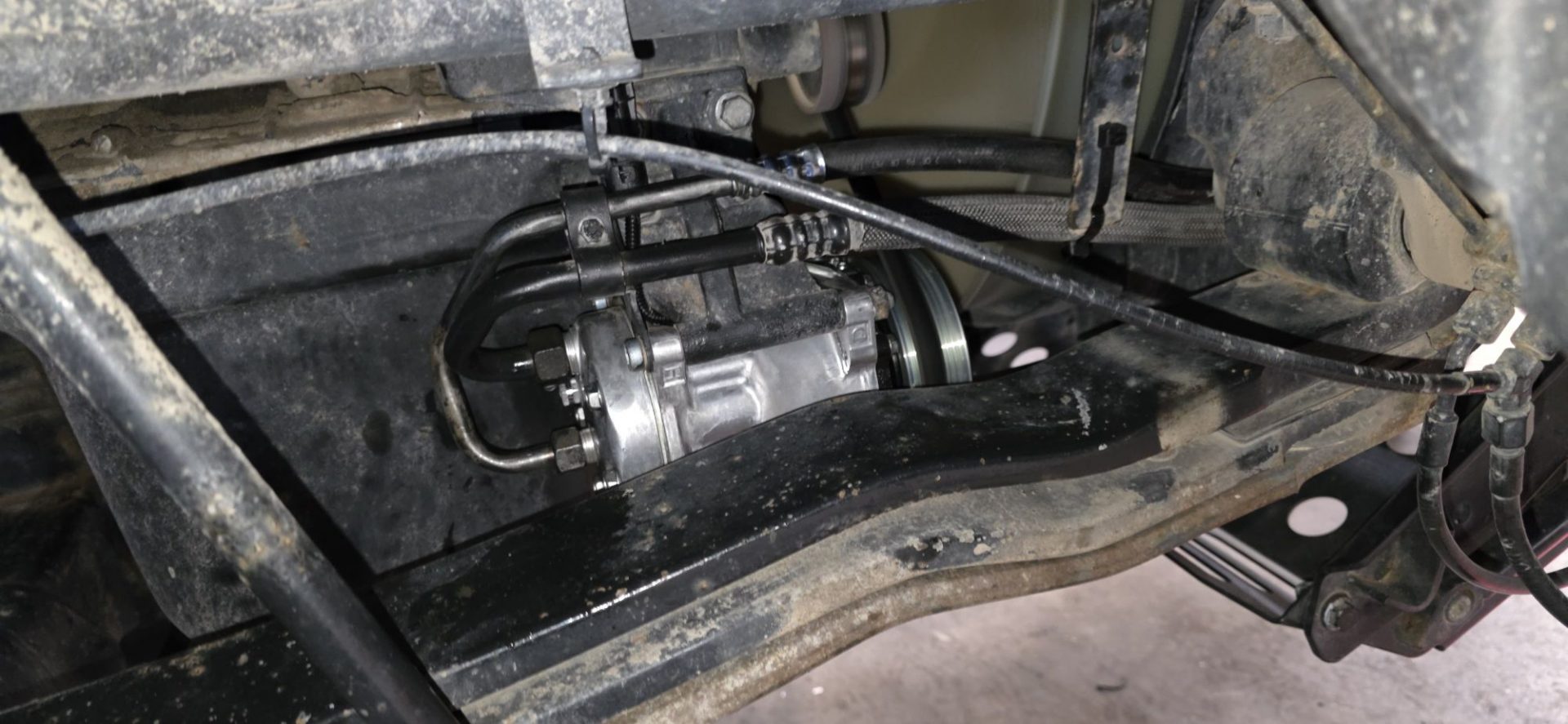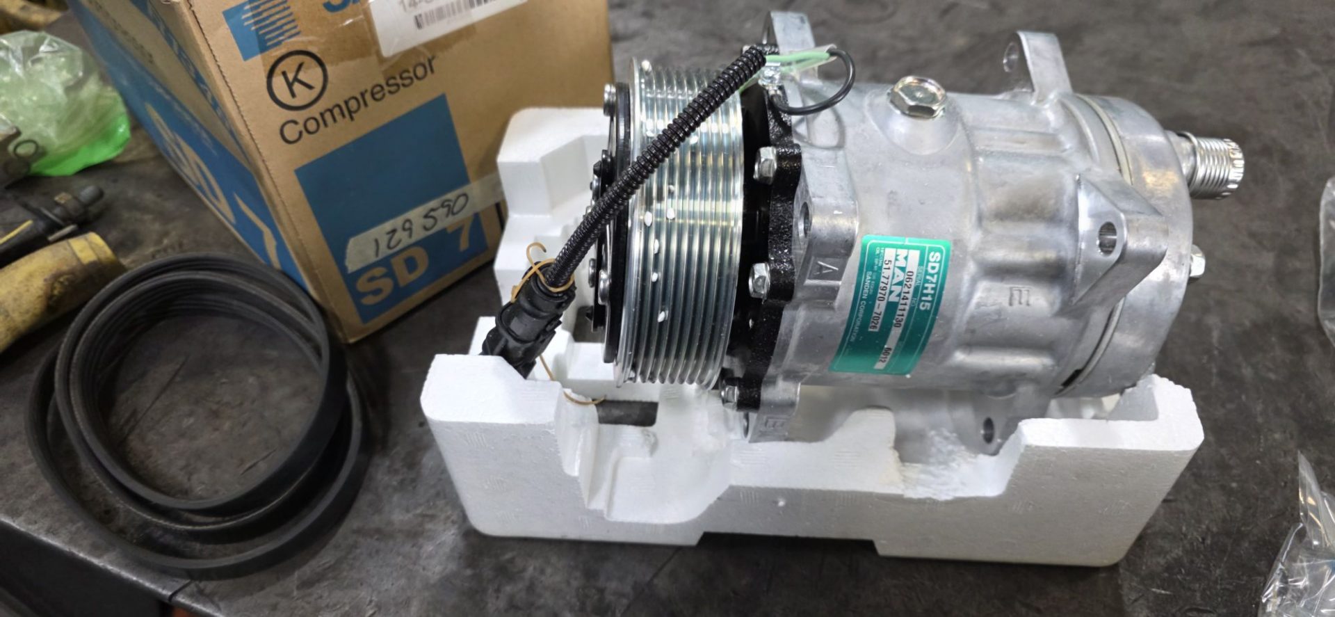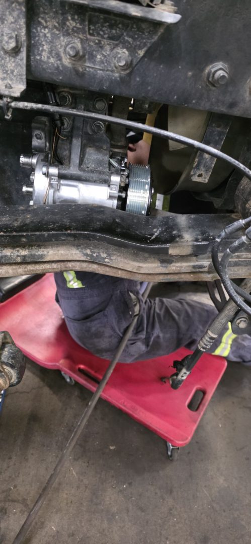 216435 km : Et nous voilà dans le garage Plett Truck (banlieue de Vancouver) pour mettre en place notre nouveau compresseur de climatisation, et sa courroie 😉