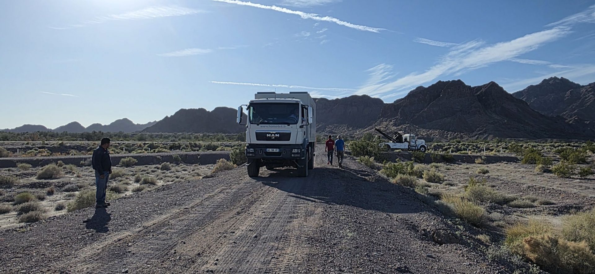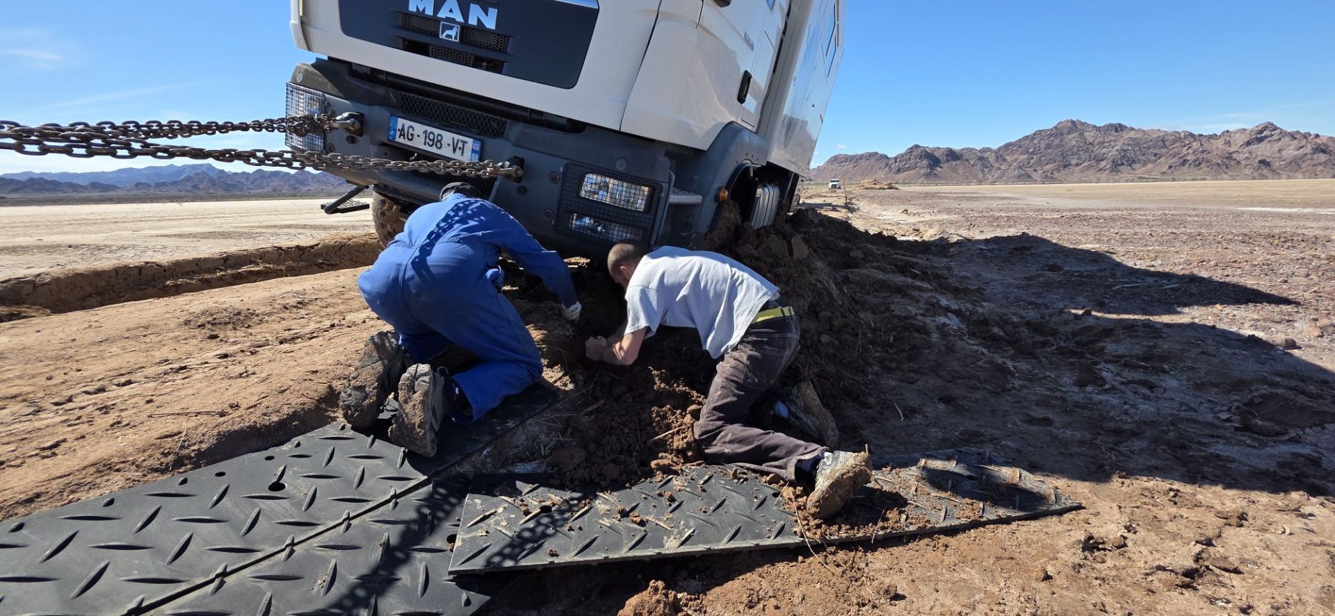et la dépanneuse tire le camion jusqu’à la limite des plaques. On renouvelle l’opération jusqu’à la fin des ornières. Ensuite, ça roule tout seul, mais il faut éviter de nombreux pièges sur la route. Marc n’étant pas encore fluent en espagnol 😜, Cruz a pris le volant de notre camion. Nous avons prêté notre VHF à un des membres de l’équipe de dépannage et Marc accompagne Cruz qui a donc pris le volant. C’est plus facile pour suivre les multiples consignes de guidage 😉