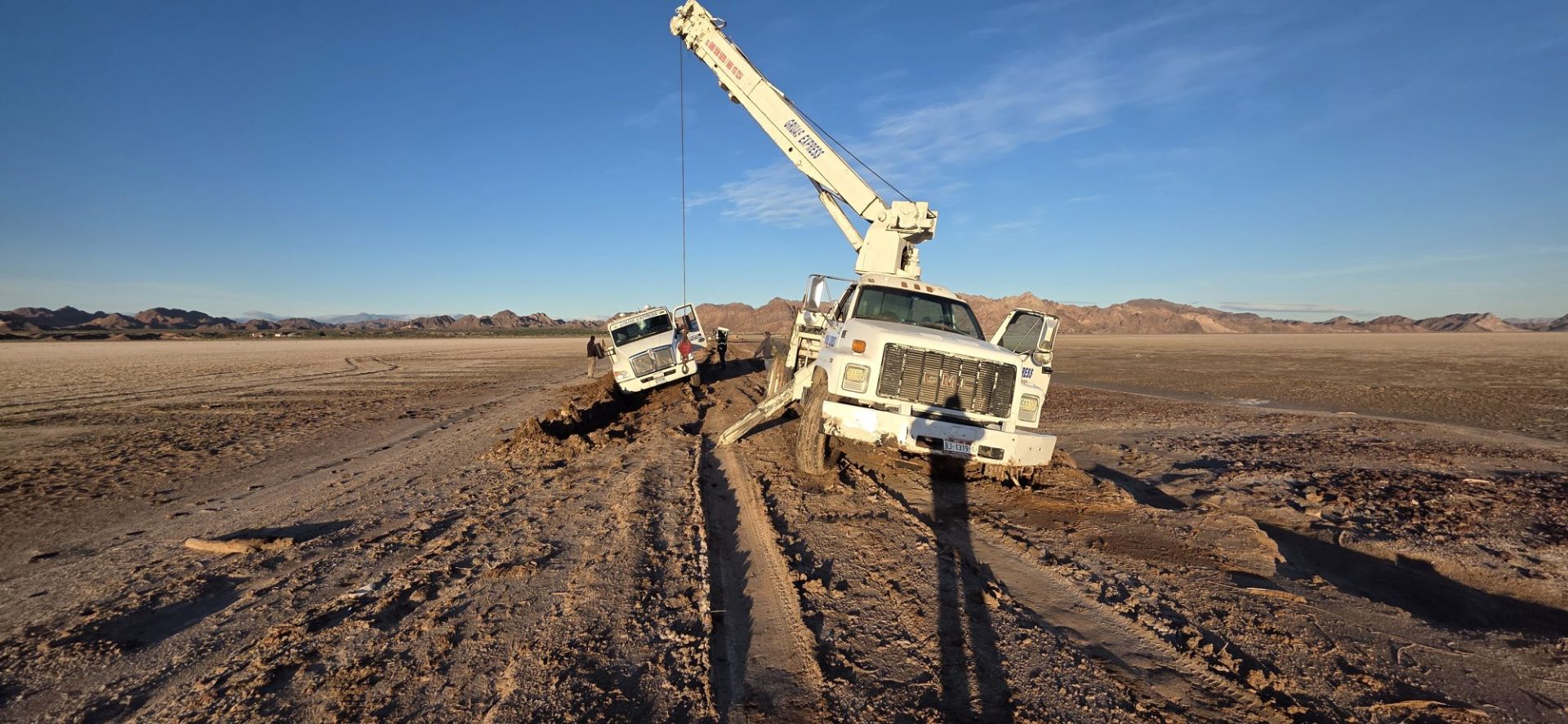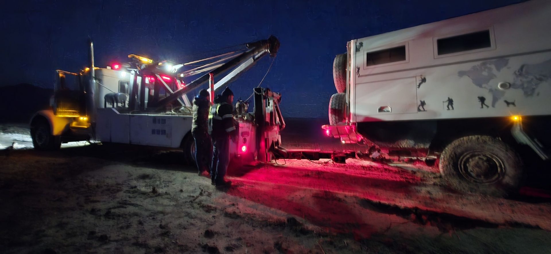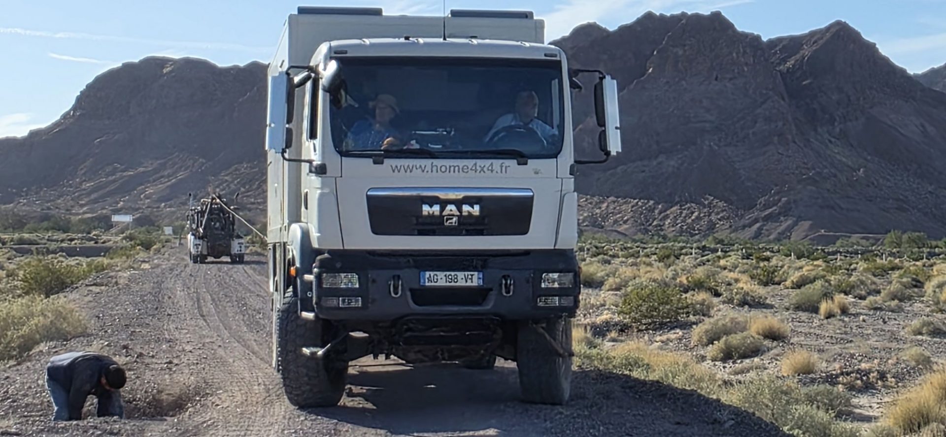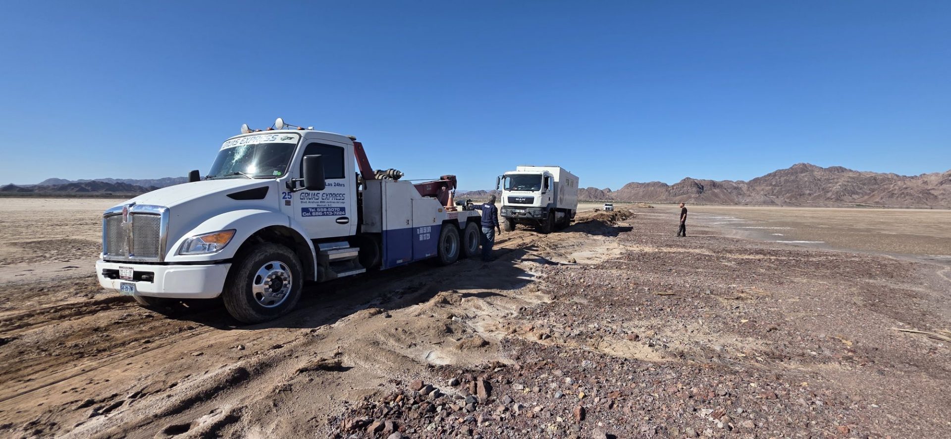 Nous avons la visite d’un groupe d’ingénieurs, intrigués par la position de notre camion. Comme nous ne sommes pas loin de la route principale, nous sommes très visibles par les autres véhicules. Ils nous proposent de contacter un dépanneur. L’attente sera un peu longue car la grue vient de Mexicali qui se trouve à un peu plus de 100 km. Ils nous négocient même le prix : 14000 pesos soit environ 700 euros.