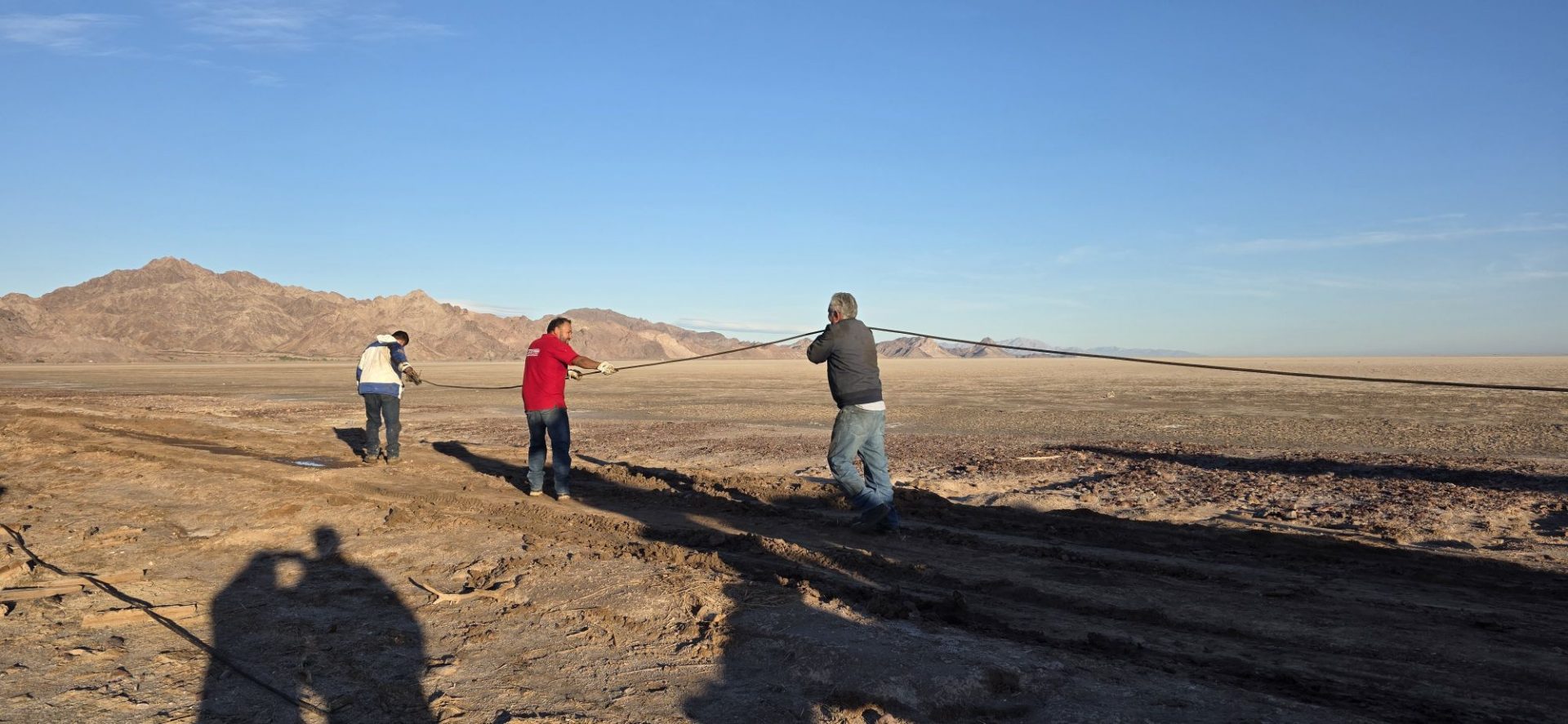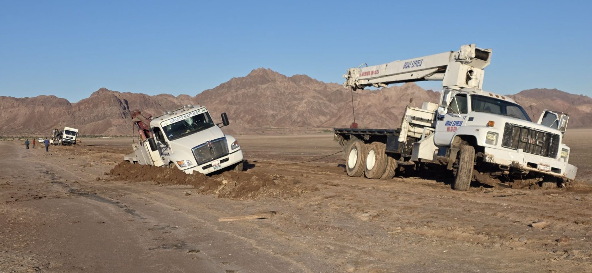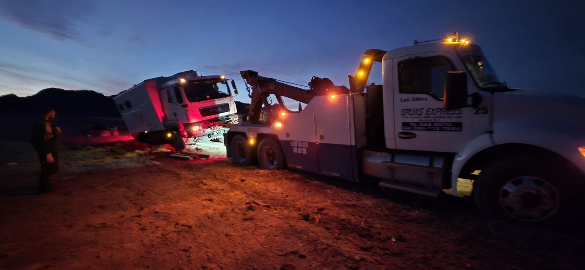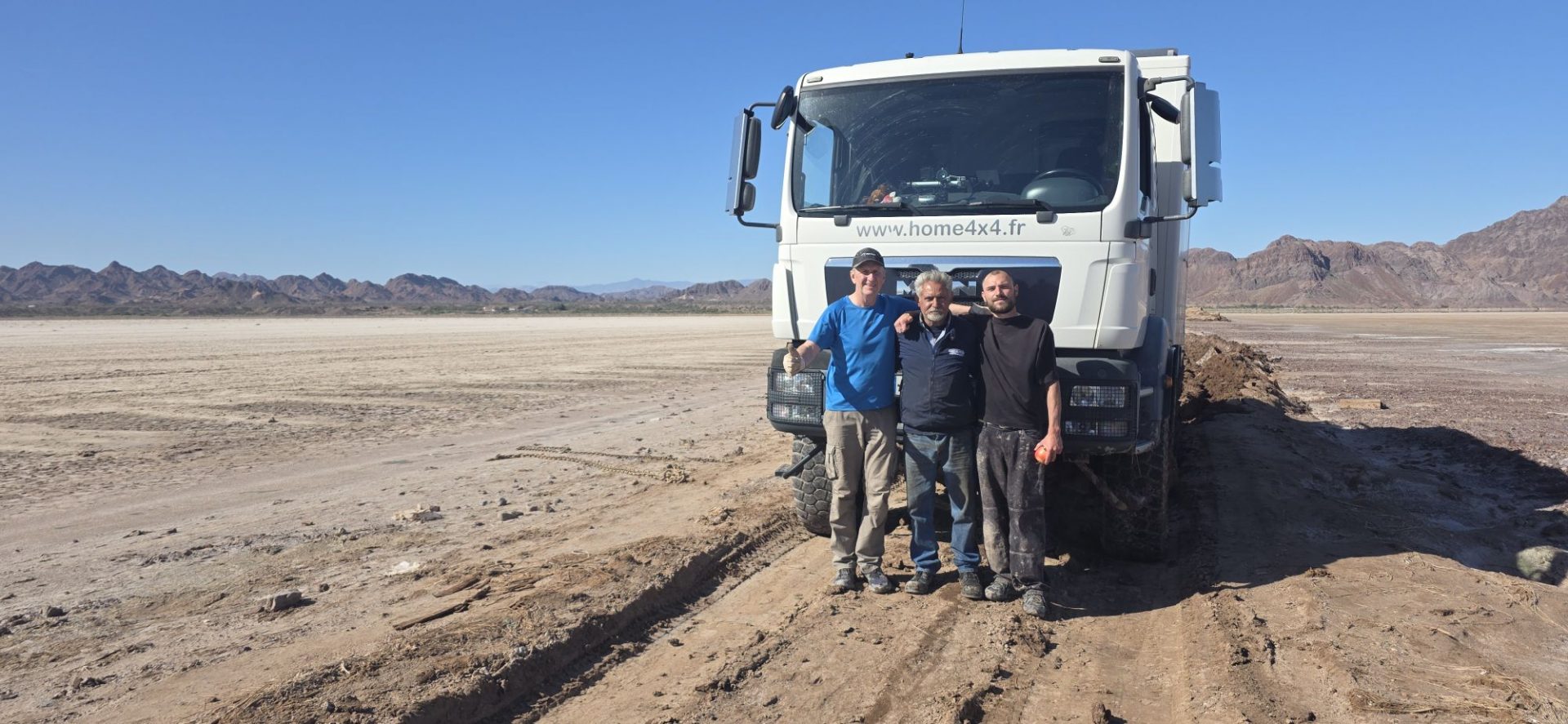 Nous avons la visite d’un groupe d’ingénieurs, intrigués par la position de notre camion. Comme nous ne sommes pas loin de la route principale, nous sommes très visibles par les autres véhicules. Ils nous proposent de contacter un dépanneur. L’attente sera un peu longue car la grue vient de Mexicali qui se trouve à un peu plus de 100 km. Ils nous négocient même le prix : 14000 pesos soit environ 700 euros.
