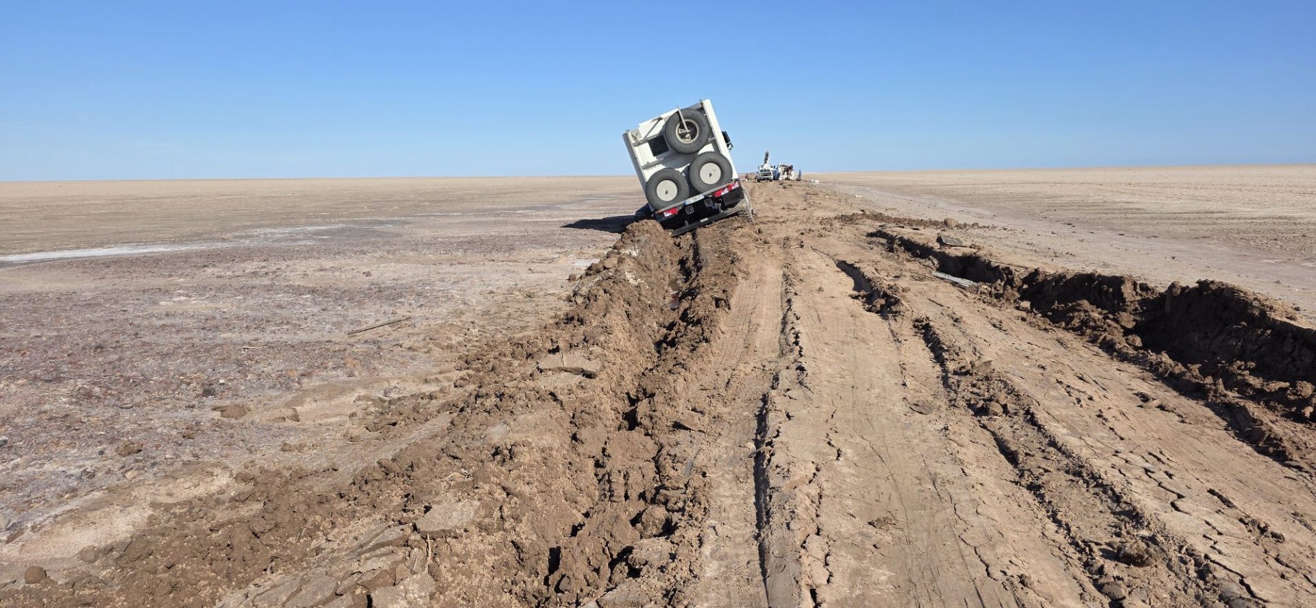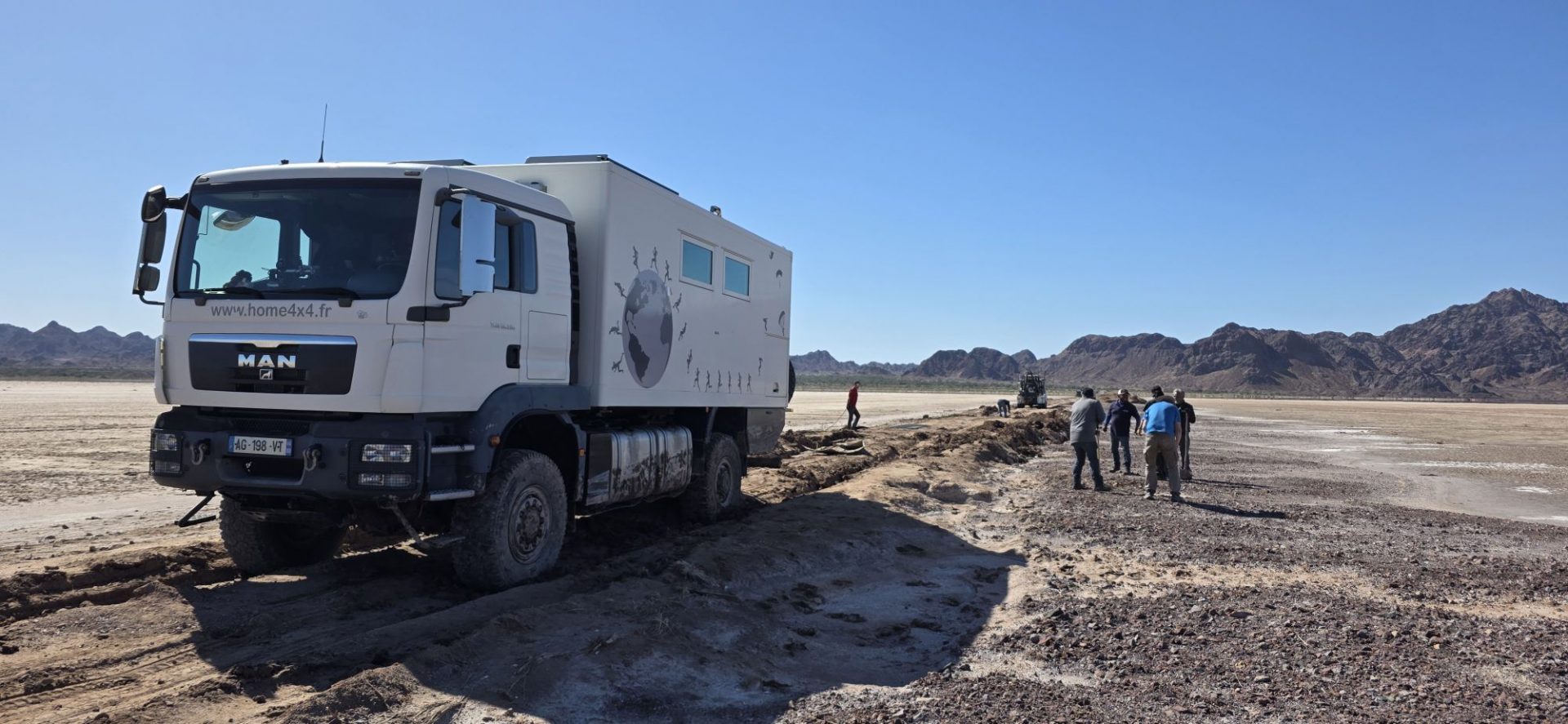 On s’en sort bien car on aurait pu abîmer le camion, ou pire… le perdre 😱😭. Le bilan technique se résumera à un marchepied tordu, un volant plus tout à fait droit et une tonne de glaise accrochée au camion. On gérera cela demain.