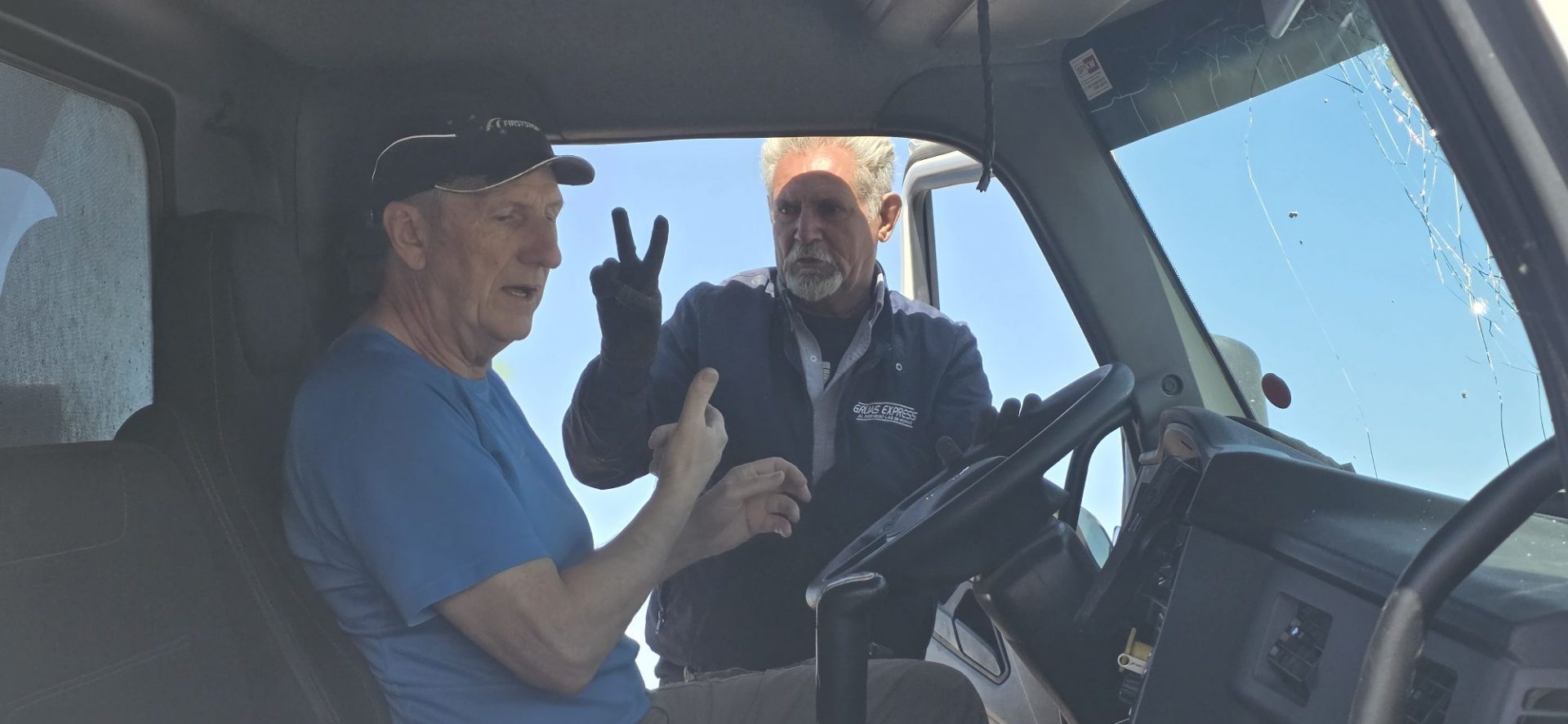 Marc conduit le camion de Cruz pendant que Cruz essaye, avec la grosse grue, de sortir son camion de l’ornière… Malheureusement, il faudra attendre l’arrivée de l’équipe complète de dépannage