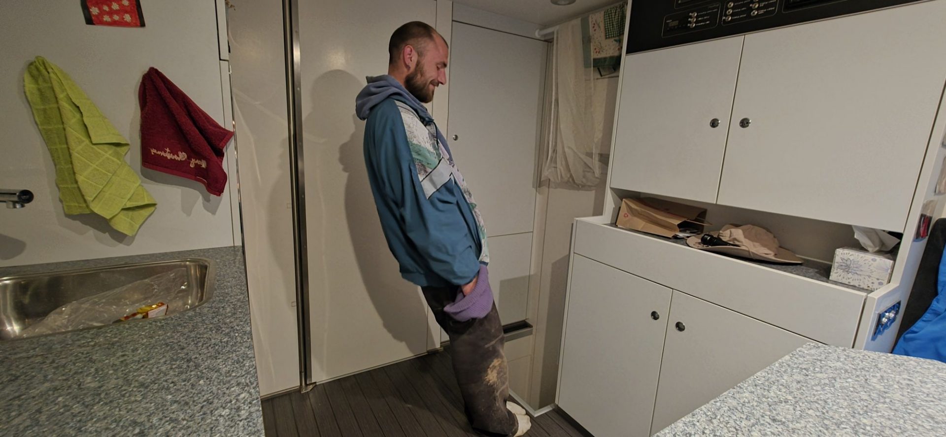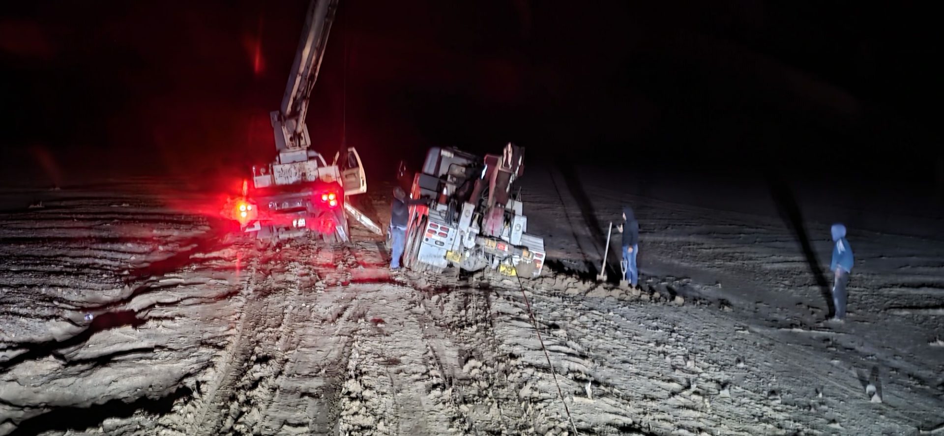 Après plusieurs tentatives des uns et des autres, il est décidé de tout arrêter. Une troisième dépanneuse viendra demain matin. Chacun ira dormir dans son camion. Il est plus de 1h00 du matin, nous allons nous installer dans notre camion penché (26°). Nous invitons Marius à nous rejoindre. Ce n’est pas facile de se tenir debout et de manger dans cette position 🤣. Il vaut mieux en rire mais le stress est à son maximum !