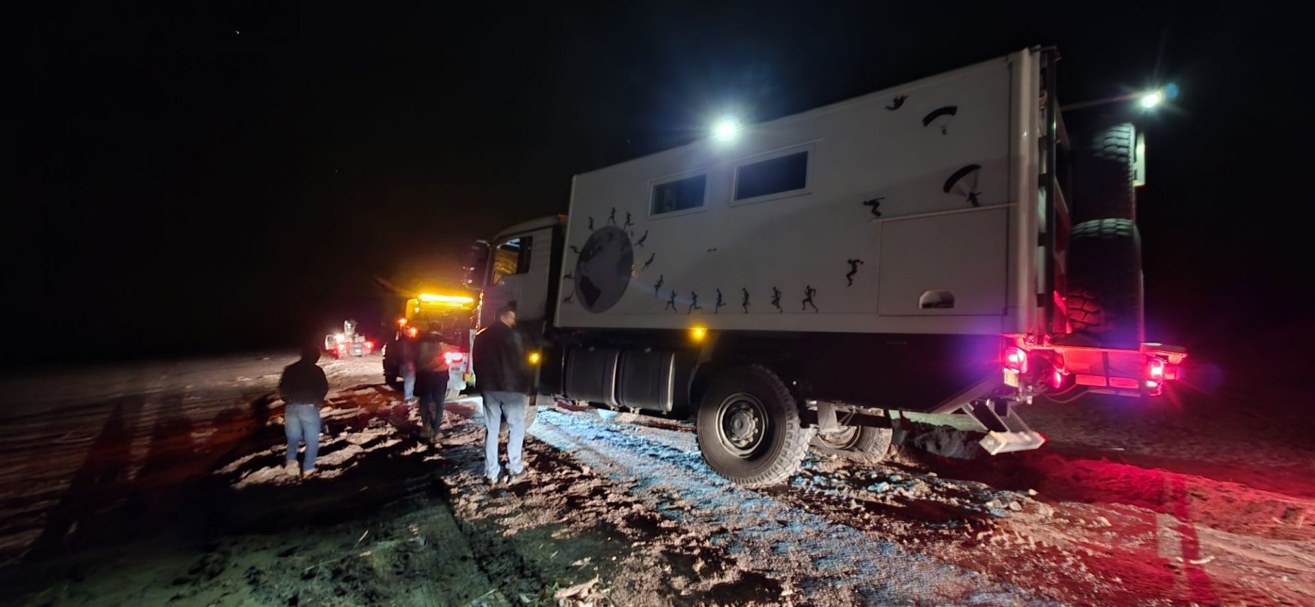 19 fevrier : La nuit sera courte car la troisième dépanneuse arrive à 5h30. L’équipe essaye de nous tirer par l’arrière du camion… Ça ne marche pas !