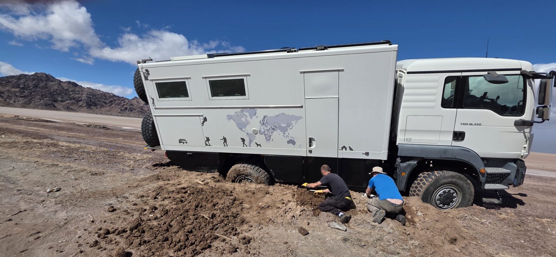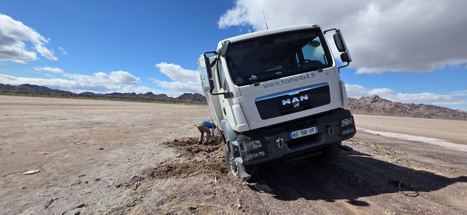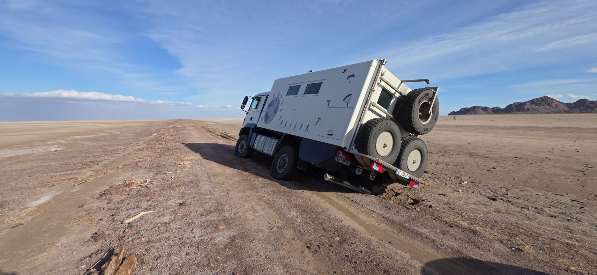 Et vlan… une nouvelle fois, nous voilà dans une ornière 😭. Le stress est à son comble. Arriverons-nous à sortir de ce bourbier sans y laisser des plumes… le camion n’est pas assuré Tous Risques juste en Responsabilité Civile. Une nouvelle nuit sur le salar ???
