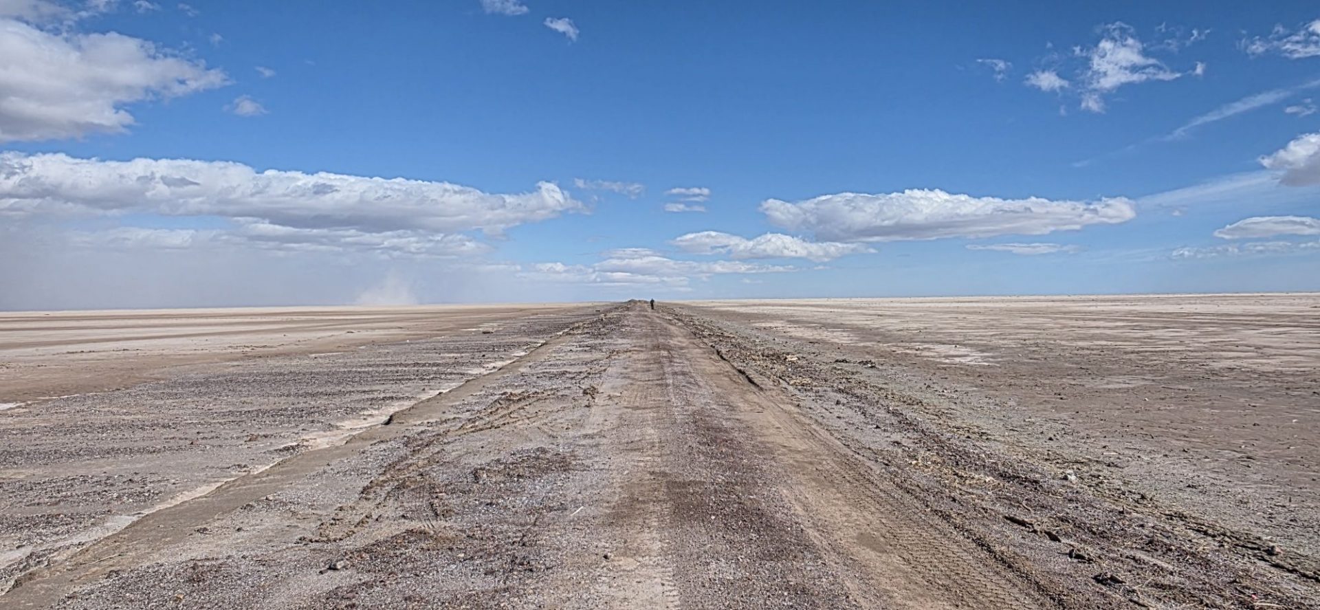 Il fait beau mais un vent violent souffle sur le salar. Tout s’envole et part très loin. Le blouson de Marc a eu des envies d’évasion. Grâce à Marius et à son plongeon dans le salar, Marc a pu récupérer son blouson. Le petit point au loin sur la piste, c’est Marius qui revient avec le blouson 😉 !