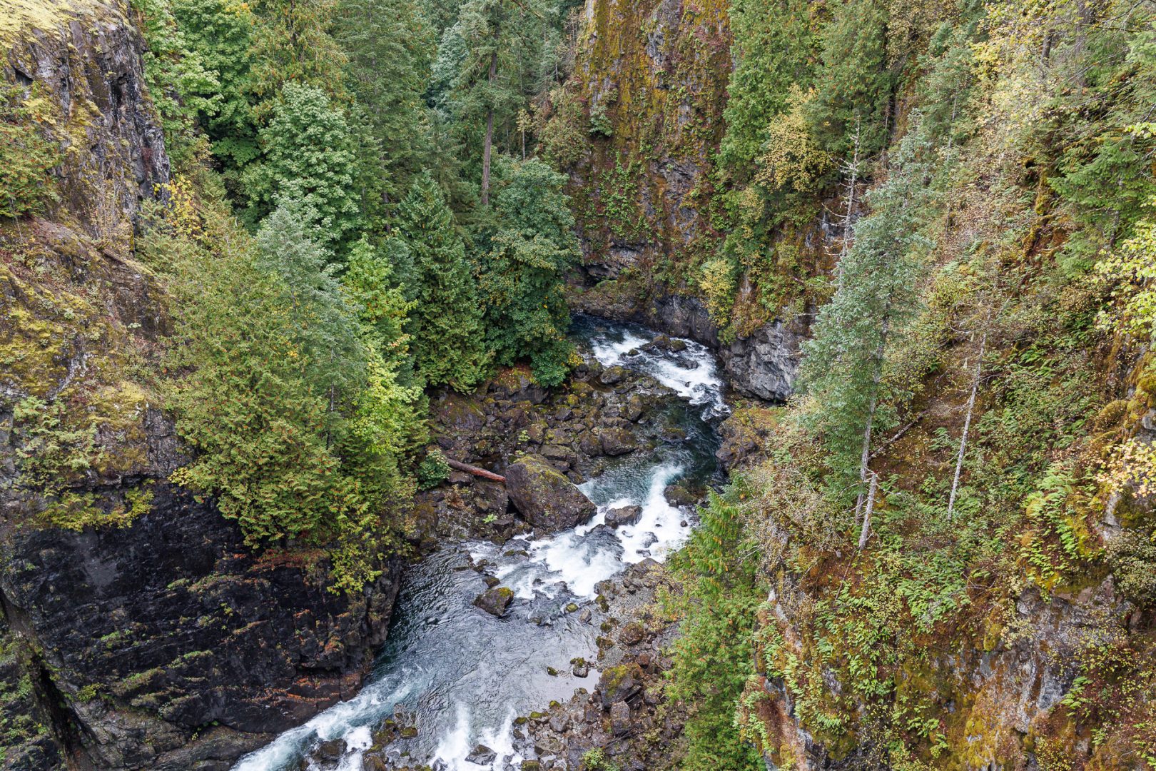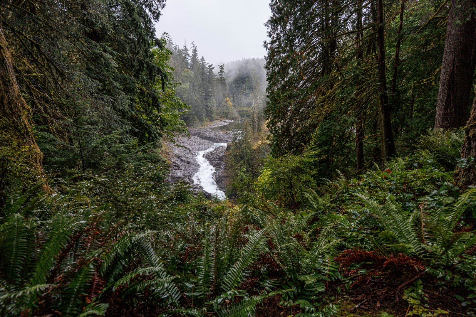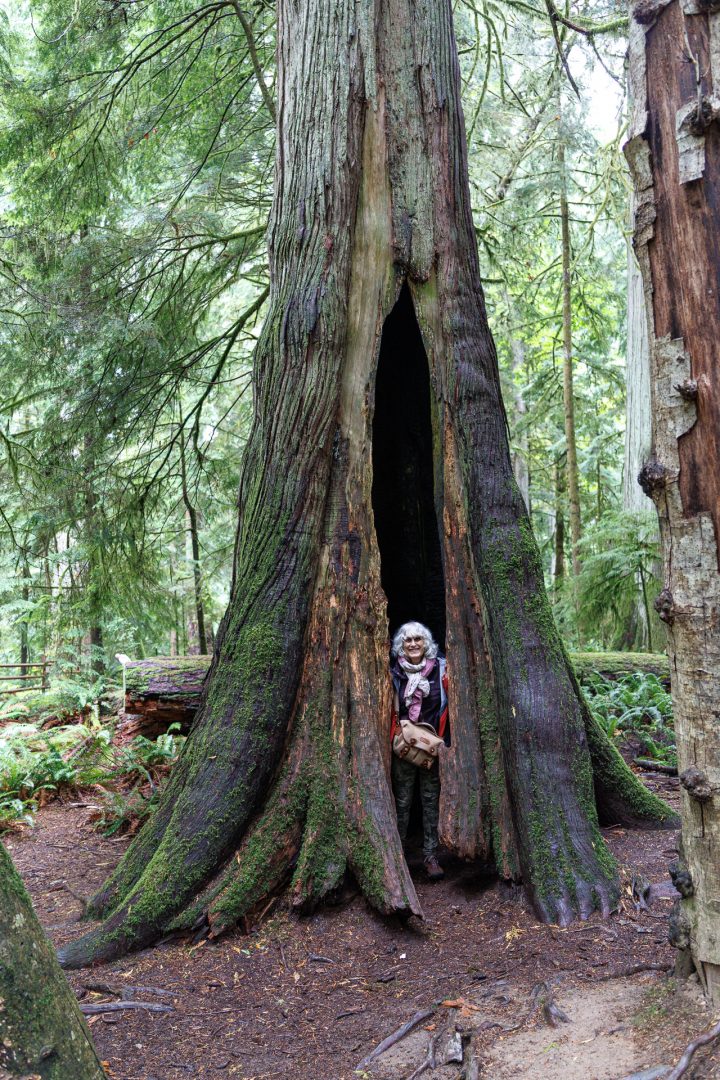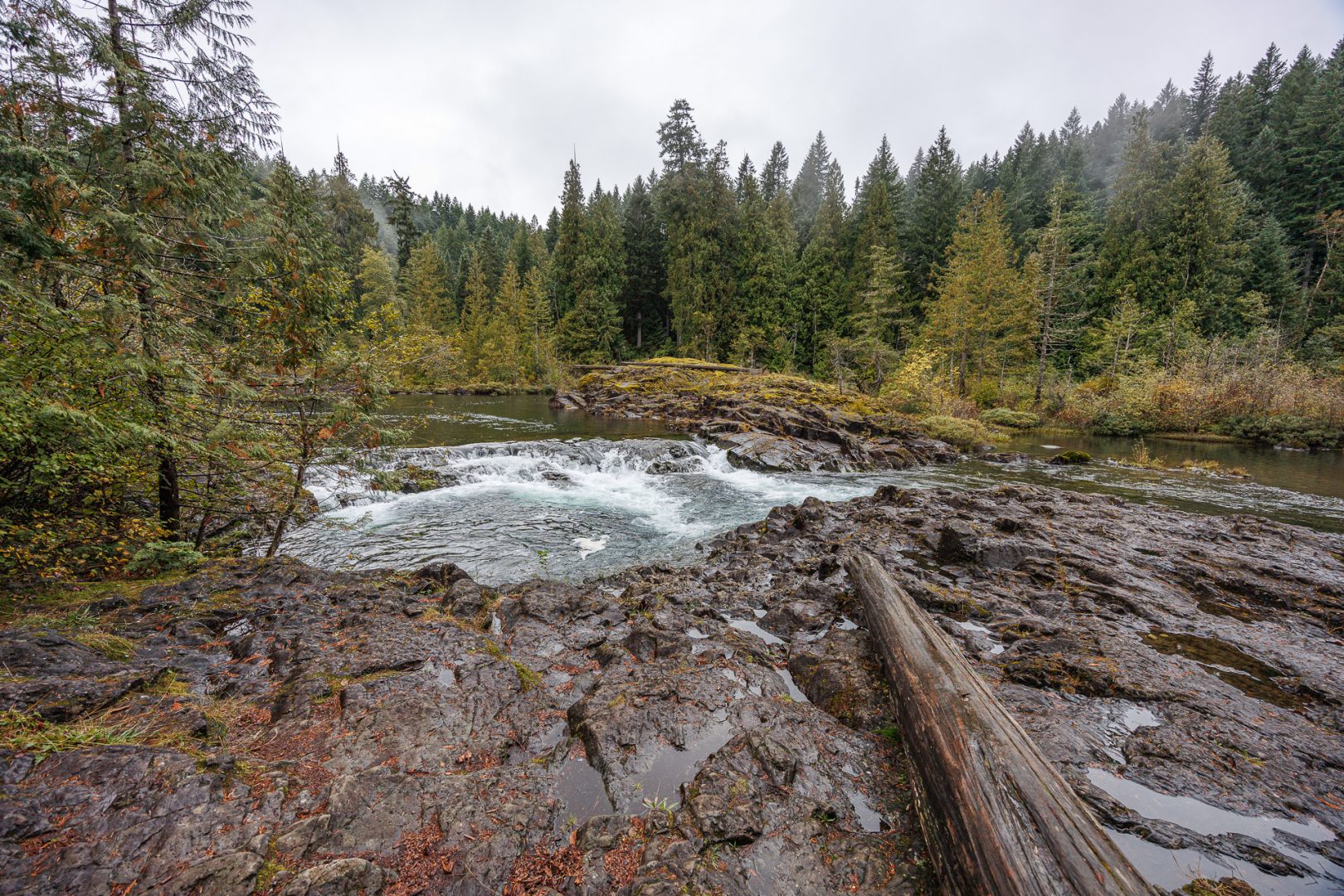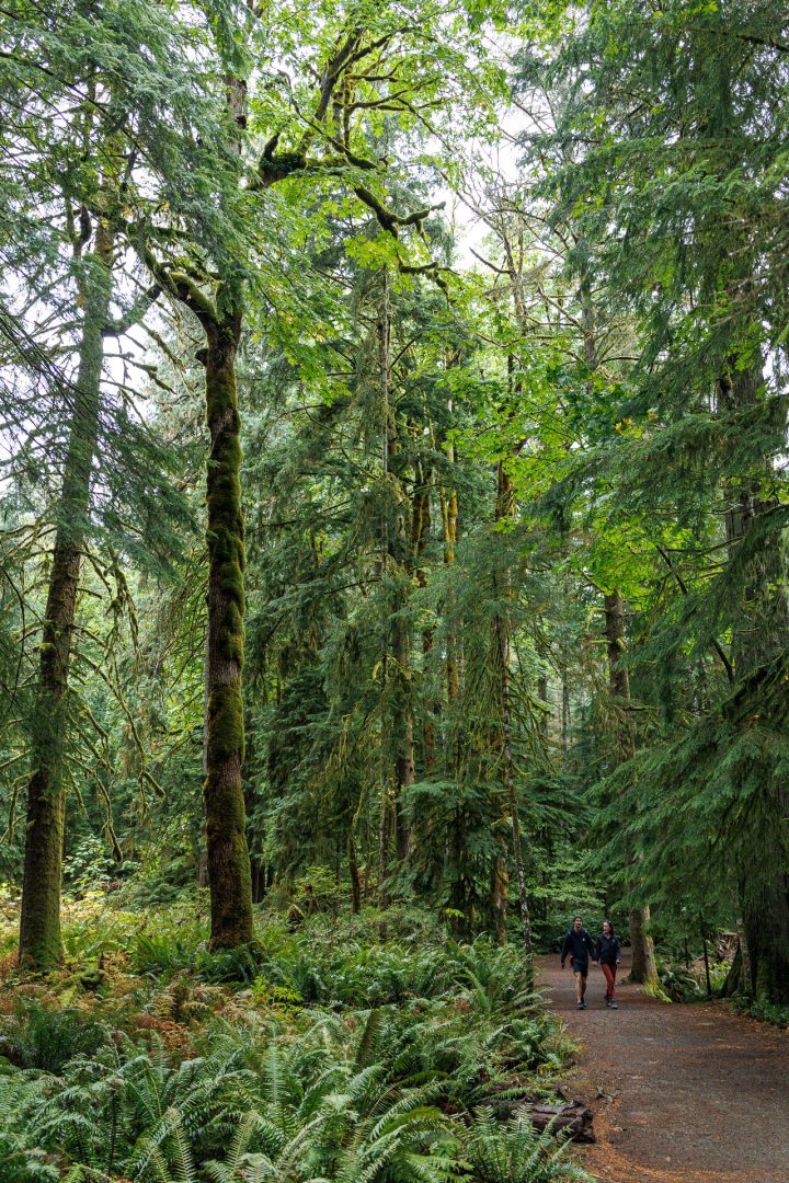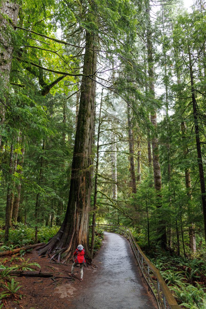 Un joli sentier à travers bois nous conduit près de la rivière. Depuis notre arrivée sur l’ile de Vancouver, nous avons remplacé les sommets enneigés par les forêts majestueuses composées principalement de cèdres rouges de l’Ouest (thuyas géants) et de sapins de Douglas. C’est très différent mais tout aussi beau 🤩 !