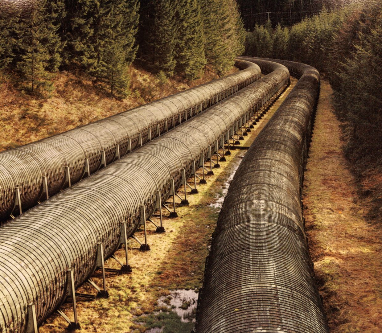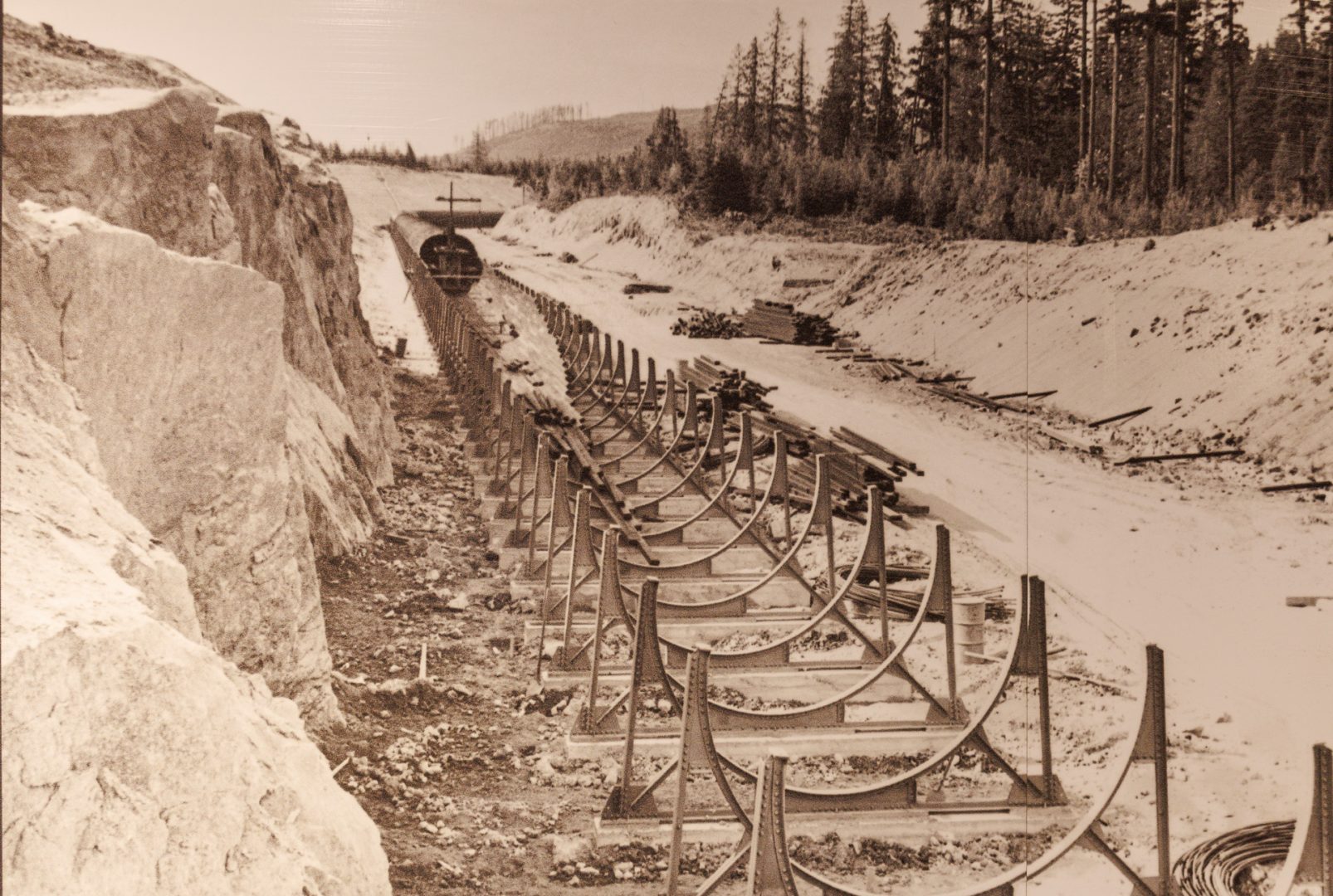 A l’origine en 1947, ces 3 conduites étaient en bois car l’acier juste après la guerre était rare et donc très cher. Les conduites étaient constituées de pièces de bois de 6 mètres de long et de 15 cm de côté, ajustées et mises en forme comme pour les coques de bateaux. Le tout était recouvert de tôle ondulée et a tenu jusqu’en 2014. Étonnant 🧐