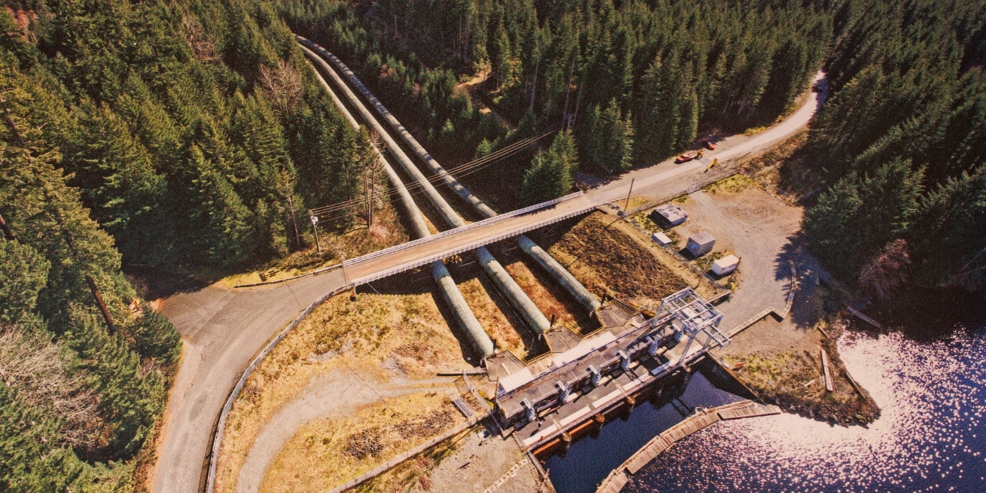 Le barrage principal John Hart Dam avec ses 3 conduites forcées aujourd’hui métalliques.