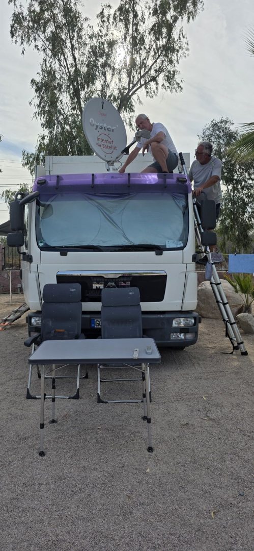 Marc en profitera également pour démonter l’antenne satellite du camion de Viviana et Roland et installer à sa place, avec Roland, l’antenne Starlink que de nombreux voyageurs utilisent aujourd’hui pour accéder à Internet de n’importe où.