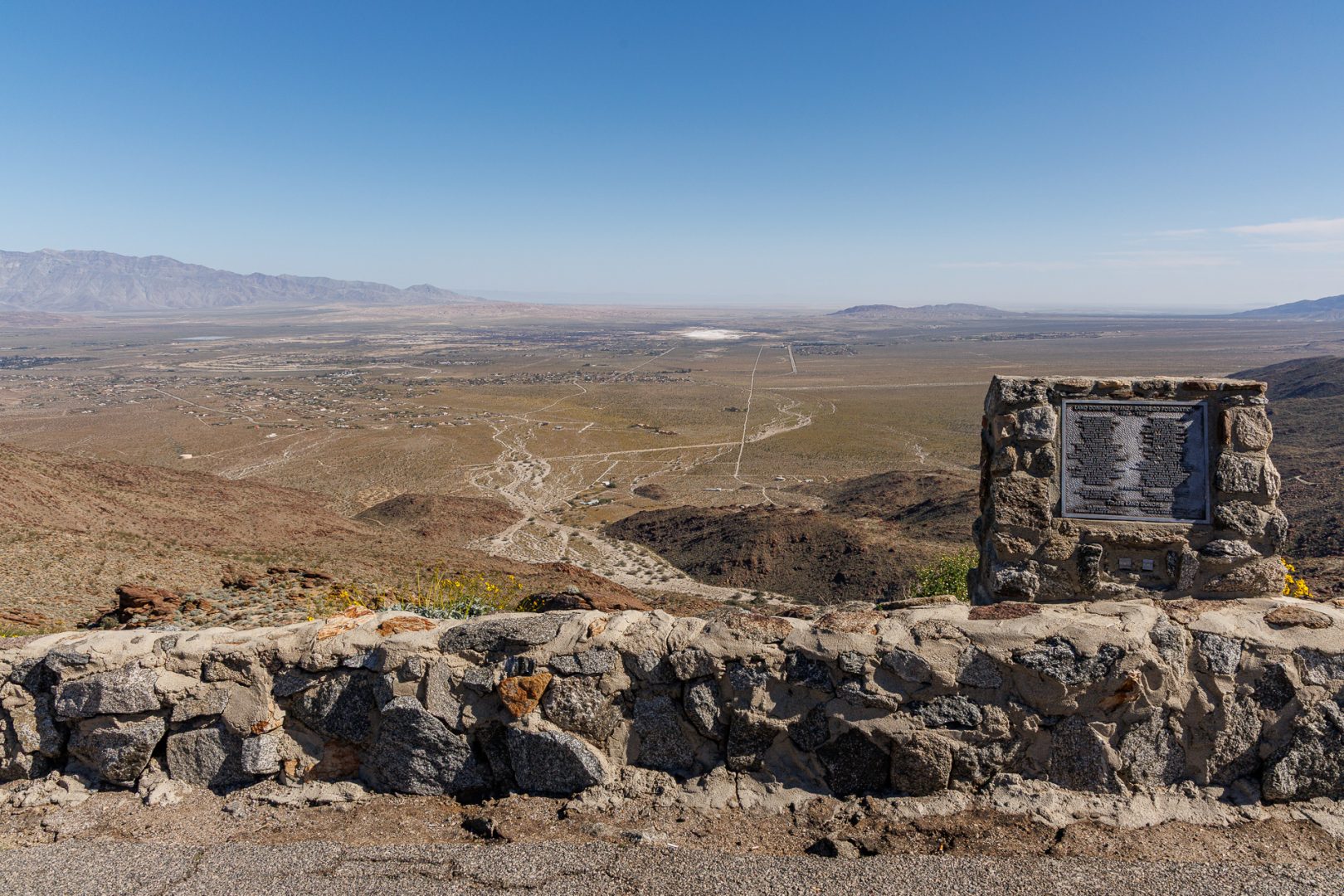 La vue depuis la route est impressionnante !! Elle fournit des indices sur l’évolution des paysages du parc, d’un océan à une savane herbeuse, jusqu’au désert que nous voyons aujourd’hui. Il s’agit du plus grand parc d’État de Californie, et du second parc d’Etat américain hors Alaska, couvrant 240 000 ha. La plaque sur la droite rend hommage aux donateurs, démarche fréquente aux États-Unis.