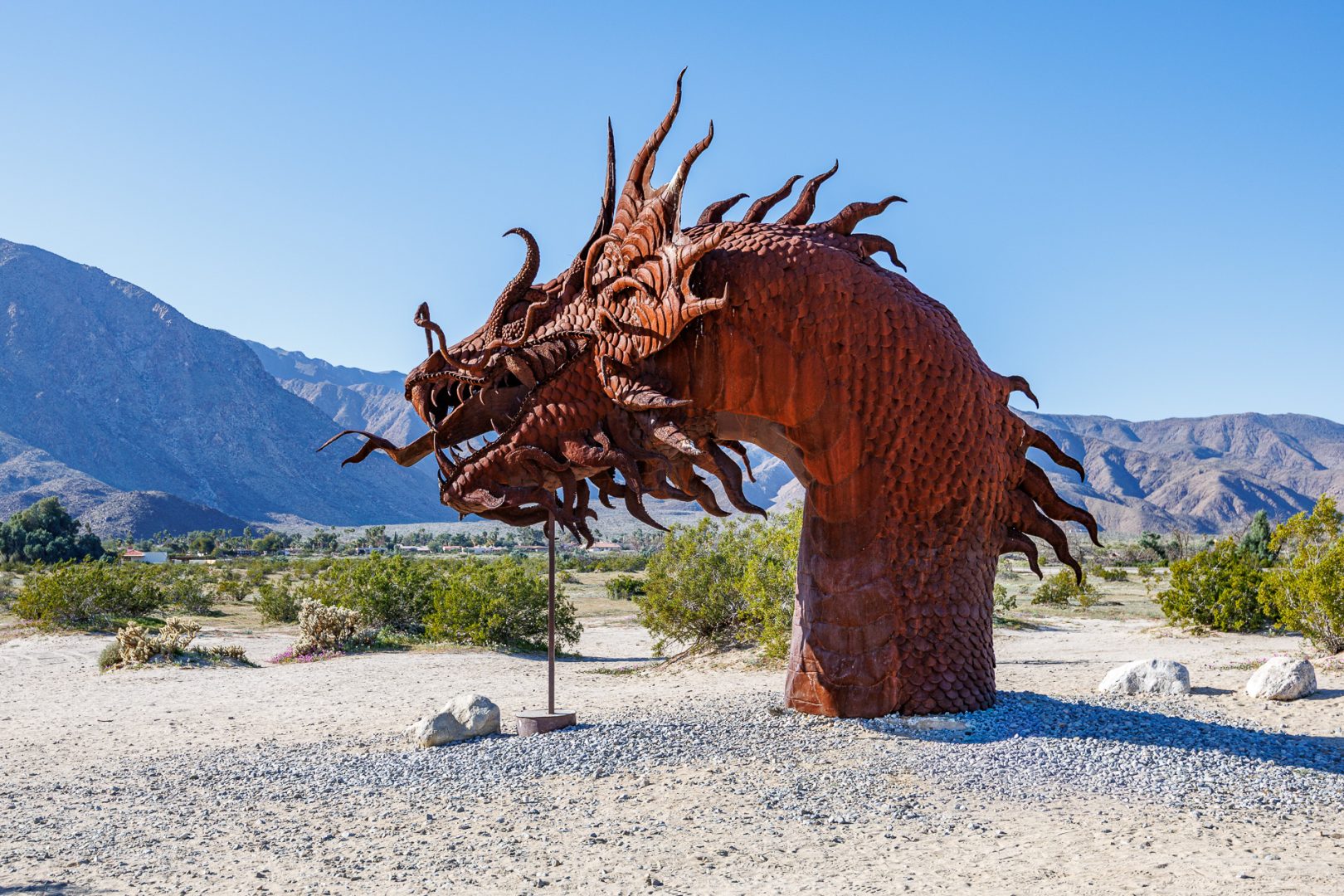 Ce magnifique dragon s’élève à environ 4,5 mètres au-dessus du sol et mesure 107 mètres de long. Il donne l’illusion de s’enfoncer dans le sable du désert et de passer sous la route.