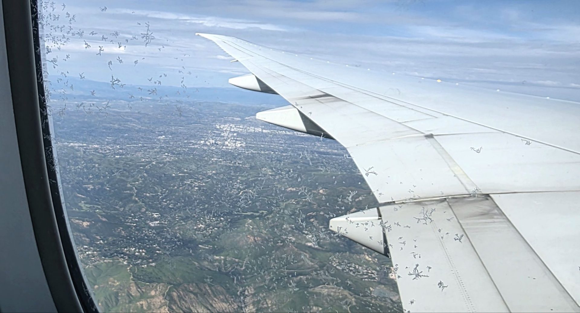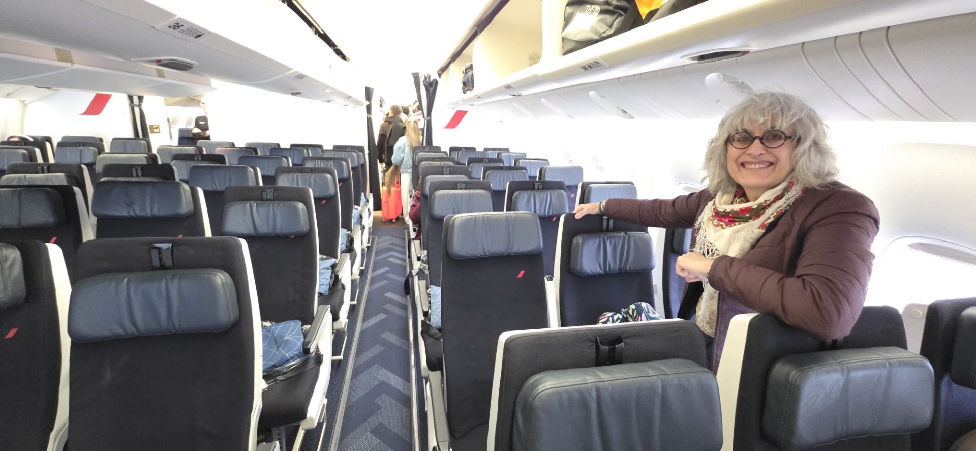 A notre grand étonnement, l’avion est à moitié plein. Toute notre zone (Eco avec espace supplémentaire pour les jambes) sera pratiquement vide 😲. Nous serons à l’aise pour voyager 😊. Sympa et surprenant à la fois… Certains voyageurs ont même pris les rangées vides pour s’allonger et dormir 👍 !