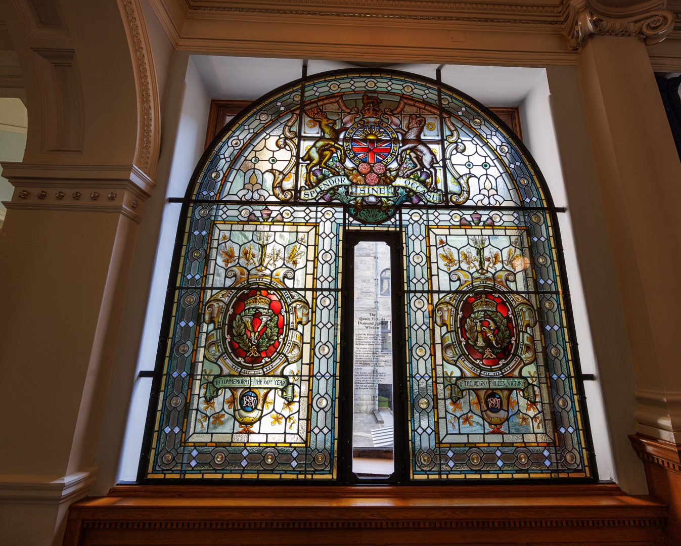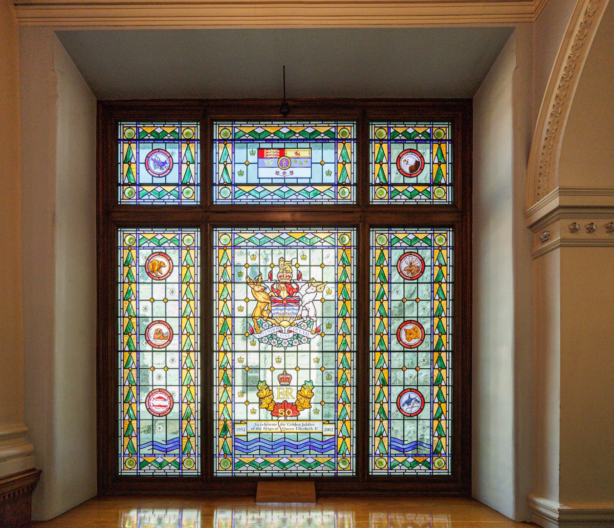Après cette présentation de l’organisation administrative de la Colombie Britannique, nous poursuivons notre découverte du bâtiment. Ce vitrail du Jubilé de diamant fut commandé en 1897 en l’honneur du 60ème anniversaire du règne de la reine Victoria. Il a été fabriqué par Powell Brother Ltd (Angleterre).