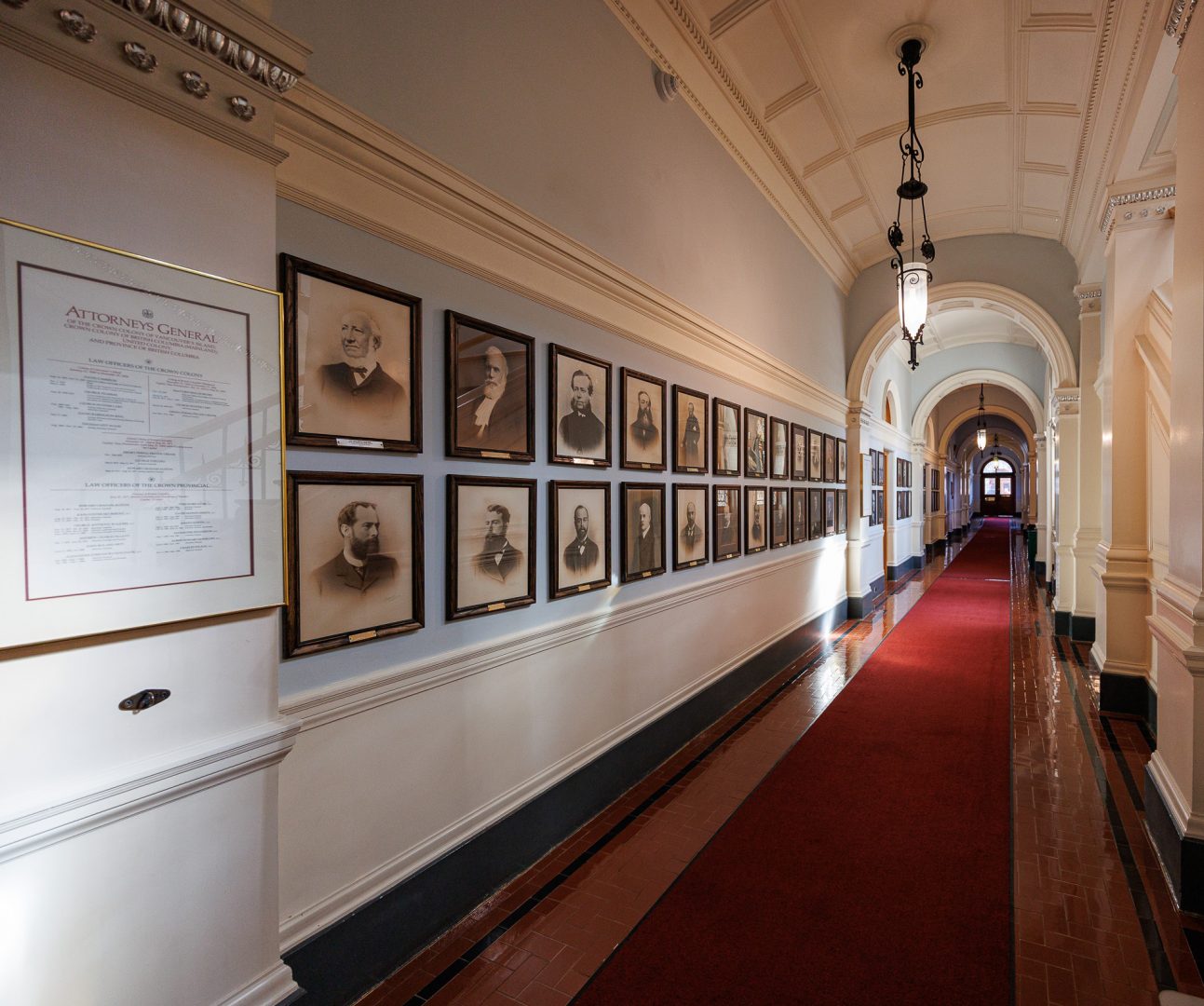 Le couloir des Procureurs Généraux de la Colombie-Britannique depuis 1859. Le Procureur Général fournit des conseils juridiques aux ministères provinciaux, dirige les litiges civils et est responsable de la conduite des poursuites judiciaires au nom de la province. En 2025, la procureure générale de la Colombie-Britannique est Niki Sharma.